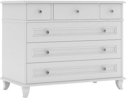 %description% WYMIARY: Wysokość: 87 cm Szerokość: 106/110* cm Głębokość: 48/50* cm *SZEROKOŚĆ I GŁĘBOKOŚĆ PODANA Z BLATEM Nóżka: 10 cm Prowadnica: Invisible + Soft close / 6 szt. Uchwyt: Kryształowy na srebrnej stopce / 9 szt. MATERIAŁ Drewno liściaste Malowana płyta MDF Komoda dziecięca Charlotte …