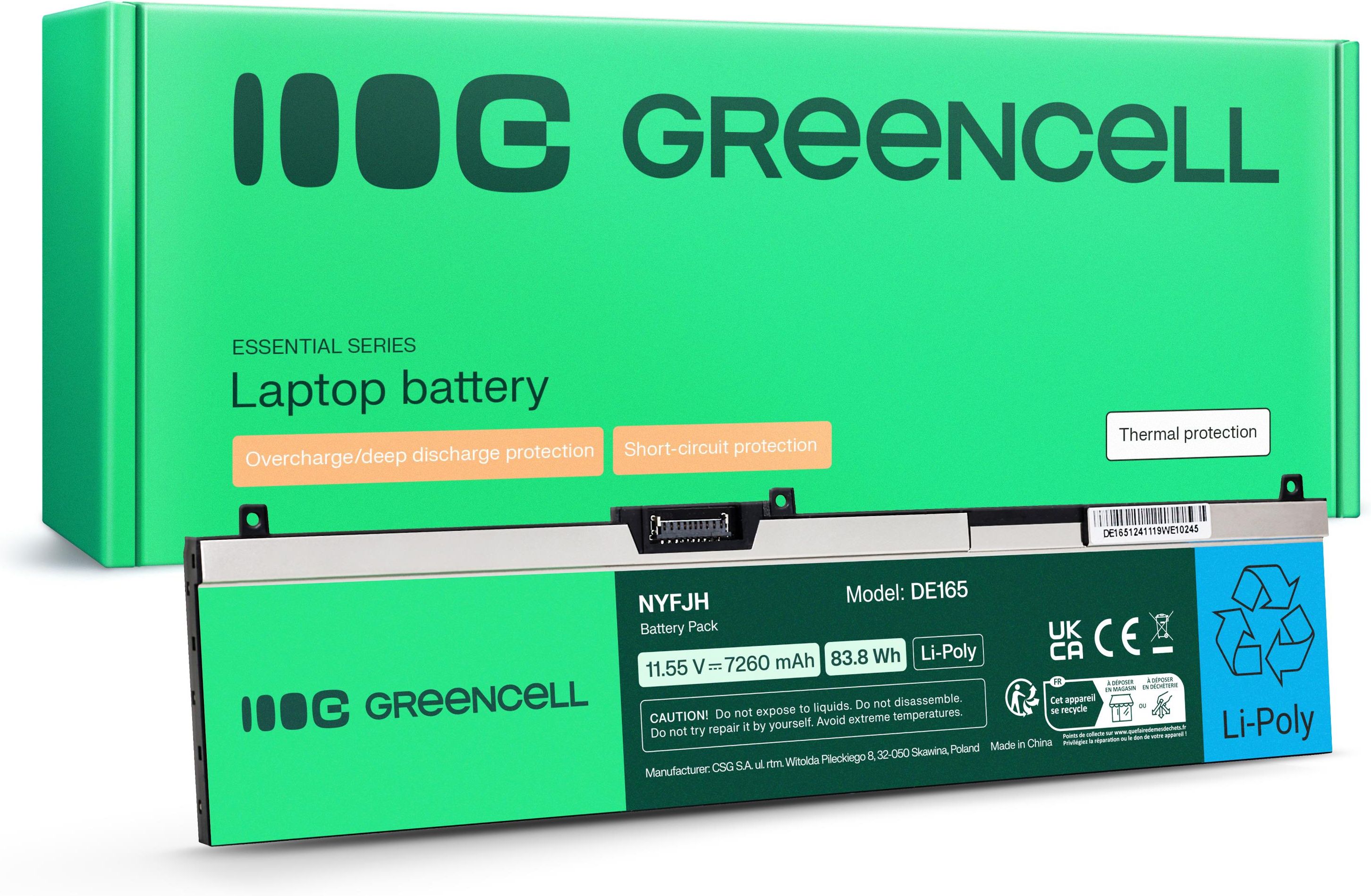 Ogniwa Li-Poly ✅ Pojemność 7260mAh (83.8Wh) ✅ Od 4 do 4.5 pracy Do 1000 pełnych cykli ładowania ✅ Polski producent Bateria Green Cell NYFJH-6C 0NYFJH 0RY3F9 0VRX0J dedykowana do laptopów Dell Ogniwa litowo-polimerowe - to sprawdzone akumulatory o dużej, realnej pojemności, wysokiej trwałości i bez efektu pamięci. Długi czas pracy - zastosowane ogniwa gwarantują od 4h do 4.5h pracy na baterii (w zależności od konfiguracji laptopa i trybu pracy). Wysoka trwałość - ogniwa wytrzymują nawet do 1000 cykli ładowania, co przekłada się na 2-3 lata bezproblemowego funkcjonowania. Po około 1 roku działania nadal zachowują ponad 80% pojemności. Precyzyjne wykonanie - najwyższej jakości materiały i dokładnie odwzorowany kształt sprawiają, że bateria jest idealnie dopasowana do obudowy laptopa i łatwa w montażu. Do laptopów Dell - Precision 15 7530 7540 7740 (pełna lista powyżej opisu aukcji). Specyfikacja Producent: Green Cell Rodzaj ogniw: Li-Poly Czas pracy na baterii: 4h do 4.5h Pojemność: 7260mAh (83.8Wh) Napięcie: 11.55V Ilość ogniw: 6 Certyfikaty: CE, RoHS Kod produktu: DE165 Zastosowane zabezpieczenia elektroniczne: przeciwprzepięciowe, przed przegrzaniem, przed nadmiernym rozładowaniem, przed przeładowaniem Nowoczesna elektronika sterująca Dzięki niej bateria komunikuje się z laptopem zapewniając informacje o stanie naładowania, pozostałym czasie pracy, czy czasie do pełnego naładowania. W większości modeli zastosowano układy elektroniczne renomowanej firmy Texas Instruments używane również w oryginalnych akumulatorach. Gwarantuje to: Stuprocentowe dopasowanie do elektroniki i sterowników komputera - bateria komunikuje się z laptopem dokładnie tak jak oryginalny akumulator. Zaawansowane zabezpieczenia - zabezpieczenie przed nadmiernym rozładowaniem, przeładowaniem i zabezpieczenie termiczne dają pewność właściwego i bezpiecznego działania baterii.