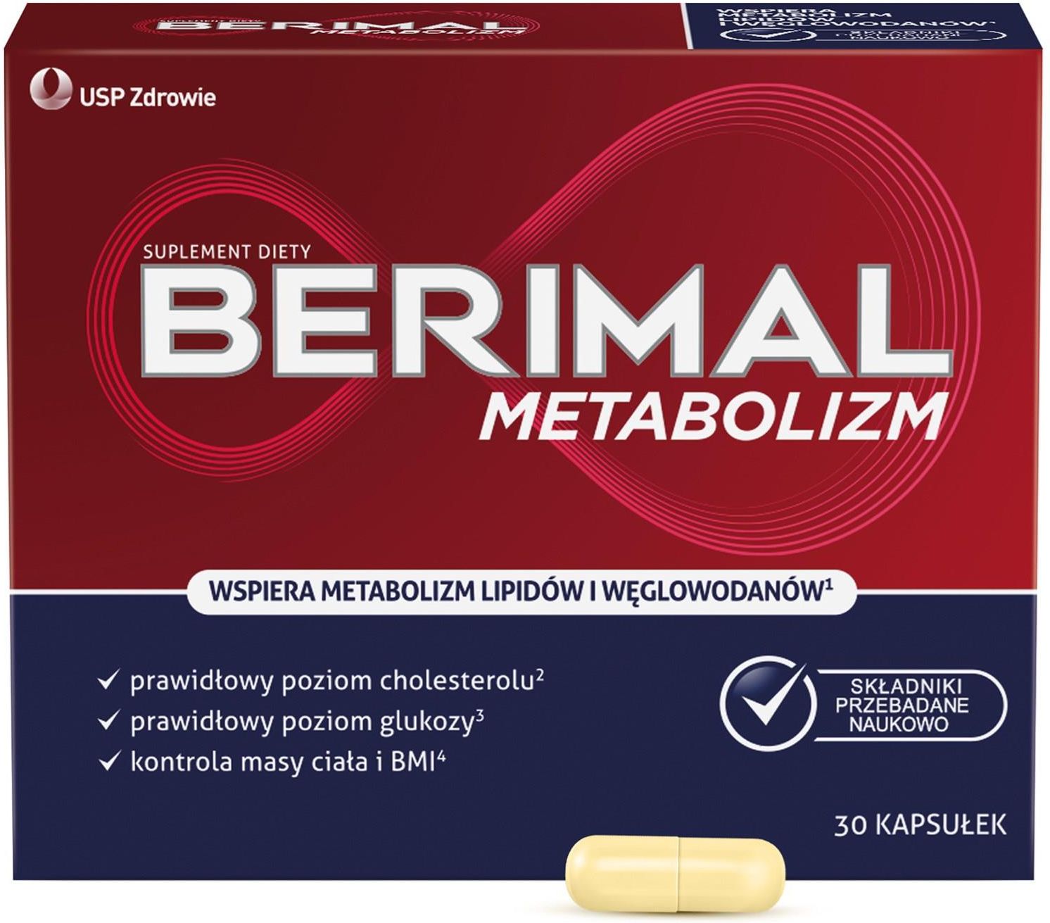 Usp Zdrowie Berimal Metabolizm 2 x 30 kaps + pojemnik na leki Berimal Metabolizm – suplement diety dla osób, które dbają o utrzymanie prawidłowej gospodarki tłuszczowej i węglowodanowej oraz metabolizmu, opracowany na podstawie najnowszej wiedzy medycznej oraz badań naukowych. Zalecane spożycie: Dorośli: 2-3 kapsułki dziennie przed posiłkiem. Kapsułki należy połknąć i popić wodą. Nie zaleca się wysypywania zawartości kapsułki do pożywienia z uwagi na gorzki smak. Składniki: Sproszkowany sok z owoców bergamoty (Citrus bergamia Risso) standaryzowany na zawartość 38% polifenoli BPF (ang. Bergamot-derived Poliphenol Fraction); hydroksypropylometyloceluloza (otoczka kapsułki roślinnej); ekstrakt z liści zielonej herbaty (Camellia sinesis); witamina B6 (pirydoksalo-5-fosforan); barwnik: tlenki i wodorotlenki żelaza; pikolinian chromu; witamina B12 (metylokobalamina). Właściwości składników: Ekstrakt z bergamoty pozyskiwany jest z miąższu owoców Citrus bergamia Risso. Do produkcji Berimalu Metabolizm pozyskiwane są owoce bergamoty z tradycyjnych upraw zlokalizowanych na wybrzeżu Kalabrii na południu Włoch. Ekstrakt z bergamoty, tzw. BPF (Bergamote-derived Polifenolic Fraction) standaryzowany jest na obecność 5 flawonoidów z grupy polifenoli: neoeriocytryny, neohesperydyny, naringiny, melitydyny i brutierydyny. Ekstrakt z zielonej herbaty wspomaga metabolizm tłuszczów i pomaga utrzymać prawidłowy poziomcholesterolu i triglicerydów przyczyniając się do utrzymania zdrowia serca. Wspiera utrzymanie prawidłowego poziomu glukozy we krwi oraz utrzymanie prawidłowej masy ciała. Działa także antyoksydacyjnie chroniąc organizm przed szkodliwym działaniem wolnych rodników. Witamina B₆ bierze udział w prawidłowym metabolizmie homocysteiny oraz w prawidłowym pozyskiwaniu energii w procesach metabolicznych. Witamina B₁₂ wspomaga utrzymanie prawidłowego metabolizmu homocysteiny, a także wpływa na utrzymanie prawidłowego metabolizmu energetycznego. Chrom wspomaga utrzymanie prawidłowego stężenia glukozy we krwi oraz wspomaga metabolizm makroskładników odżywczych. ***Nie przekraczać zalecanej porcji do spożycia w ciągu dnia. Suplement diety nie może być stosowany jako substytut (zamiennik) zróżnicowanej diety. Istotne jest prowadzenie zdrowego stylu życia i stosowanie zróżnicowanej diety dostarczającej organizmowi wystarczającą ilość składników odżywczych. Berimal Metabolizm zawiera kofeinę (20 mg/2 kapsułki; 30 mg/3 kapsułki), katechiny (120 mg/2 kapsułki; 180 mg/3 kapsułki), 3-egalusan epigallokatechiny (60 mg/2 kapsułki; 90 mg/3 kapsułki); nie zaleca się stosowania u dzieci i kobiet w ciąży. Nie spożywać z innymi produktami będącymi źródłem kofeiny lub innych składników o podobnym działaniu. W przypadku przyjmowania leków hipolipemizujących, stosowanie produktu należy skonsultować z lekarzem. BPF nie powoduje podwyższenia poziomu aminotransferaz.