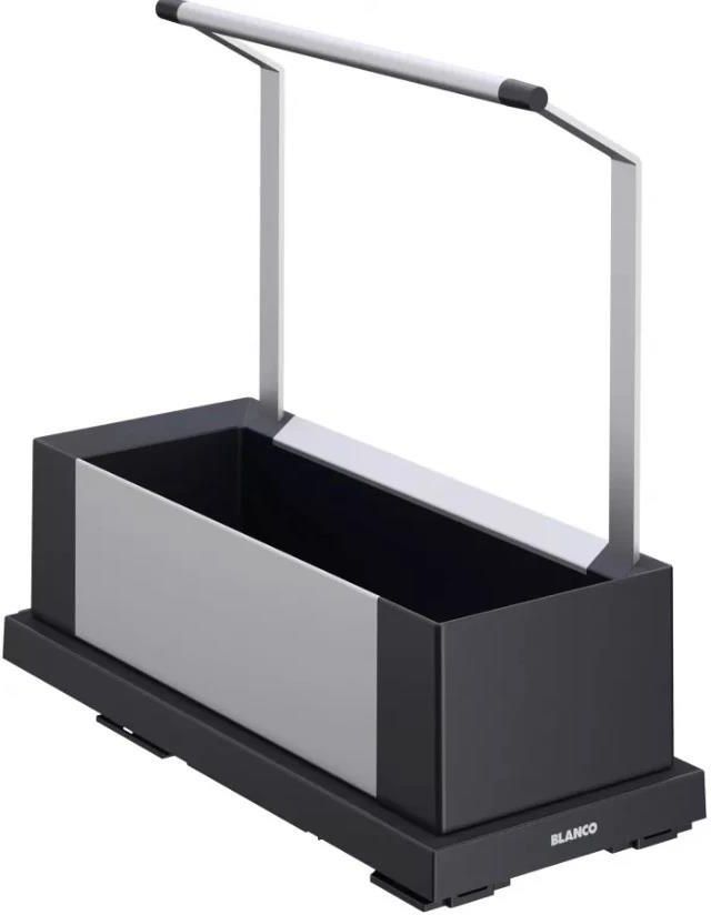 BLANCO Przenośny kosz do przechowywania Przenośny kosz zapewnia miejsce do przechowywania środków czyszczących w szafce pod zlewozmywakiem Można go łatwo wyjąć i umieścić z powrotem w wysuwanej podstawie Łatwy dostęp dzięki uchwytowi i funkcji przesuwania z możliwością pełnego wysunięcia Połączenie ciemnoszarego koloru z aluminium ładnie się komponuje ze wszystkimi elementami systemów BLANCO, służących do segregacji i organizacji szafki Łatwe utrzymywanie czystości wszystkich części dzięki dużym i gładkim powierzchniom Kosz dostępny jest w wersji pojedynczej i podwójnej Wysokość montażowa 395 mm. Głębokość montażowa prowadnic 430 mm i wysuwanej podstawy 415 mm. Maksymalna nośność jednego kosza wynosi 5 kg.