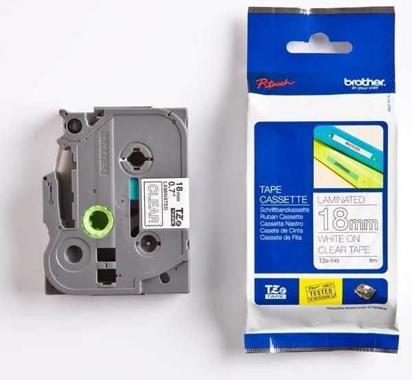 Brother TZe-145 - biała na przezroczystym tle, 18mm szerokości Laminowana taśma TZe-145 firmy Brother, kompatybilna z drukarkami P-touch. Wszechstronna i czytelna, dzięki białemu nadrukowi na przezroczystym tle. Stanowi przydatne narządzenie do znakowania zarówno w domu, w biurze, jak i w innych miejscach.  Główne cechy 18mm szerokości, 8m długości Wysokiej jakości oryginalna taśma firmy Brother Zapewnia wyraźne i trwałe rezultaty Oryginalna taśma TZe-145 firmy Brother. Gwarantuje wyraźne, trwałe i czytelne etykiety.   Sprawdzi się zarówno w domu, biurze jak i w innym miejscu pracy. Laminowana taśma TZe-145 z białym nadrukiem na przezroczystym tle. Etykiety mają wszechstronne zastosowanie - od identyfikacji akt osobowych i szafek, przez pamięć USB aż po inne aktywa.   Samoprzylepne etykiety są wytrzymałe temperaturowo, odporne na chemikalia, wodę, ścieranie. Mogą być zatem stosowane zarówno wewnątrz jak i na zewnątrz.   Taśmy TZe są łatwe i szybkie w montażu. Występują w wielu kolorach i rozmiarach, a także materiałach. Taśmy TZe z pewnością sprostają Twoim oczekiwaniom w zakresie etykiet.