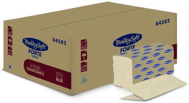 Ręcznik papierowy BulkySoft Havana Forte składany typu V-Fold (ZZ), 2 warstwy, 24x21 cm, kolor naturalny, recykling z kartonów, 4000 szt./op. Numer artykułu: 84582 BULKYSOFT HAVANA FORTE Ręcznik w składce V-FOLD Kolor: naturalny Surowiec: 100% recykling z przetworzonych kartonów Ilość warstw: 2 Gramatura: 18 gr/m2 Ilość: 4000 listków Wymiary odcinka: 24x 21 cm Ilość bind w kartonie: 20 bind po 200 listków Ręczniki papierowe składane Bulkysoft HAVANA FORTE to ręczniki EKOLOGICZNE w systemie składania V-Fold czyli popularna ZZ. Praktyczny, klasyczny ręcznik w wysokiej jakości sprawia, że jest to produkt dla każdego odbiorcy ceniącego ekologię. Naturalny, ciepły i miły dla oka kolor papieru od razu sugeruje gościom, że korzystają z produktu ekologicznego. Ręczniki wykonane są z dwóch warstw papieru, stworzonego z przetworzonych kartonów. Dzięki temu ręczniki papierowe są bardzo chłonne i wytrzymałe, a przy tym miękkie i delikatne dla skóry. Nie pozostawiają fragmentów mokrego papieru podczas użytkowania. Posiadają naturalny kolor z delikatnym i eleganckim gofrowaniem typu BulkySoft. Ręczniki sprawdzą się w pomieszczeniach każdego typu. Listki łatwo się wyciągają i są dozowane pojedynczo. Każde opakowanie zbiorcze zawiera 4000 sztuk. Ręczniki Bulkysoft doskonale sprawdzą się w łazienkach o dużym natężeniu ruchu. Produkt bezzapachowy w kontakcie z wodą. Nie wydziela zapachu przy zamoczeniu, jak inne ręczniki stworzone z makulatury dostępne na rynku. Havana Forte to najnowsza i najbardziej innowacyjna linia produktów EKOLOGICZNYCH o najwyższych właściwościach użytkowych. BulkySoft - nowa jakość artykułów higienicznych na polskim rynku BulkySoft należy do włoskiego przetwórcy celulozy Cartiere Carrara i jest jedną z najbardziej docenianych i rozpoznawalnych marek produktów higienicznych w Europie. W 2020 roku produkty BulkySoft zostały wyróżnione Laurem Konsumenta w kategorii ekologiczne i ekonomiczne rozwiązania dla instytucji i biznesu, a rok później otrzymały prestiżowy znak EKO Marka. Co ważne, artykuły higieniczne BulkySoft posiadają liczne certyfikaty ekologiczne, produkowane są z legalnie pozyskanej celulozy, przy pełnym poszanowaniu środowiska naturalnego. Wśród produktów BulkySoft znajdziesz wszystkie niezbędne artykuły higieniczne tj. papiery toaletowe, ręczniki papierowe, czyściwa gastronomiczne i przemysłowe, chusteczki higieniczne, bardzo szeroki wybór serwetek gastronomicznych, wysokiej jakości podkłady medyczne w roli oraz nowoczesne dozowniki, dyspensery i podajniki. Gama produktów BulkySoft to trzy grupy produktów: BulkySoft Classic (artykuły wykonane z czystej celulozy), BulkySoft De-Inked (artykuły higieniczne ekologiczne - z czystej celulozy z dodatkiem celulozy z recyklingu), BulkySoft Havana Forte (najbardziej ekologiczne produkty tego typu na rynku, powstające w 100% z przetworzonych kartonów, przy czym warto to podkreślić, produkty De-inked i Havana zachowują wszystkie właściwości artykułów celulozowych czyli są mocne, wytrzymałe, chłonne i bezzapachowe w kontakcie z wodą). Artykuły higieniczne BulkySoft polecamy do firm, instytucji i szkół, szpitali i wszelkiego rodzaju gabinetów lekarskich i kosmetycznych a także dla obiektów z branży HoReCa (kuchni, restauracji, hoteli) oraz zakładów przemysłowych i fabryk. Produkty BulkySoft produkowane są z wysokiej jakości surowców, starannie selekcjonowanych, co ma ogromne znaczenie na zmniejszenie zużycia i ograniczenie kosztów zakupu. Artykuły celulozowe wraz z dozownikami tworzą systemy zapewniające niższe zużycie wkładów, co przekłada się na rzadsze uzupełnianie podajników, rzadsze zakupy i tym samym mniejsze wydatki. To nowa jakość w branży czystości, odpowiedź na potrzeby współczesnego świata - artykuły BulkySoft są wydajne, higieniczne, bezpieczne i ekologiczne