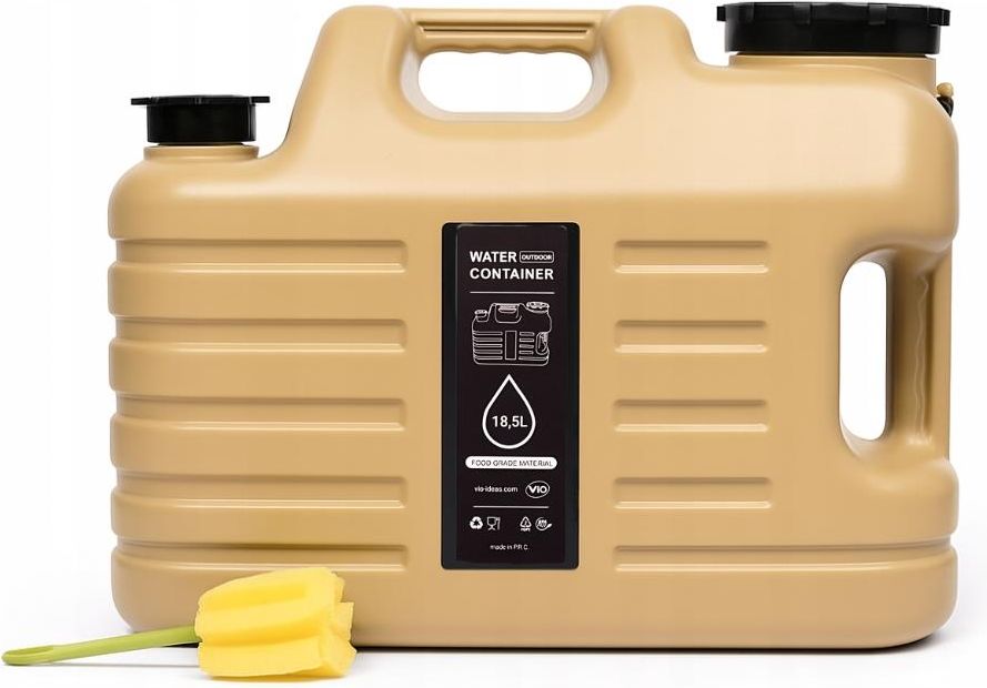 Butelka kanister na wodę ViO PET-TG 18,5 l Gold z kranem i uchwytem Kanister ViO PET-TG 18,5 l to praktyczny i wytrzymały pojemnik stworzony do przechowywania i transportu wody pitnej w każdych warunkach. Dzięki dużej pojemności świetnie sprawdza się podczas podróży, biwaków, pikników czy użytkowania w domu. Solidna konstrukcja i bezpieczne materiały gwarantują wygodę oraz długą żywotność produktu. Kanister został zaprojektowany z myślą o maksymalnej funkcjonalności. Wyposażony w praktyczny kranik, umożliwia szybkie nalewanie wody, a dodatkowa przedłużka ułatwia napełnianie naczyń. Dzięki dwóm otworom różnej wielkości można go łatwo czyścić i szybko wysuszyć, co czyni go niezwykle wygodnym w codziennym użytkowaniu. Pojemnik na wodę ViO PET-TG 18,5 l – informacje i funkcjonalność ViO PET-TG 18,5 l wykonany jest z plastiku HDPE przeznaczonego do kontaktu z żywnością, który nie zawiera BPA i nie zmienia smaku ani zapachu wody. Waży zaledwie 840 g, więc jest lekki i wygodny w transporcie, a jego kompaktowe wymiary pozwalają łatwo zabrać go w podróż lub używać w domu. Specjalny O-ring chroni wodę przed zanieczyszczeniami, a podwójny uchwyt ułatwia przenoszenie nawet pełnego zbiornika. Zalety kanistra na wodę z kranem ViO PET-TG 18,5 l Decydując się na kanister ViO, otrzymujesz niezawodne rozwiązanie do przechowywania wody: Unikalna konstrukcja – zdejmowany kranik i dodatkowa przedłużka w zestawie. Kompaktowy i lekki – tylko 840 g przy pojemności aż 18,5 l. Bezpieczny plastik spożywczy – HDPE bez BPA, neutralny dla smaku i zapachu wody. Łatwe czyszczenie – dwa otwory różnej wielkości oraz dołączona szczotka. Szczelność i higiena – O-ring chroni wodę przed kurzem i bakteriami. Podwójny uchwyt – wygodne przenoszenie w każdych warunkach. Kanister ViO PET-TG 18,5 l to wszechstronne akcesorium, które sprawdzi się w domu, biurze, na pikniku, w podróży czy podczas biwakowania. To niezawodny sposób na zapewnienie dostępu do czystej wody zawsze wtedy, gdy jej potrzebujesz.