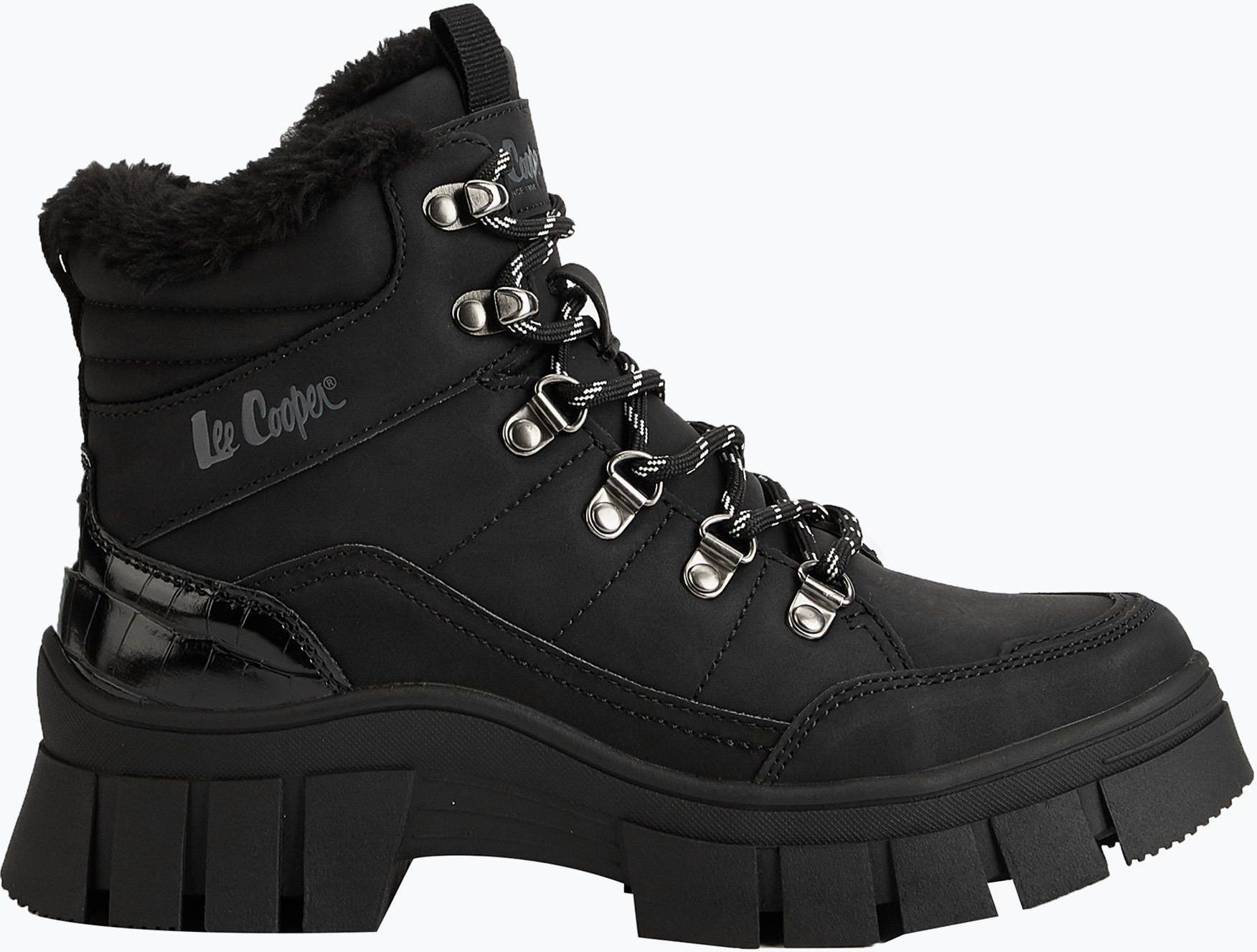 Lee Cooper buty sportowe damskie zimowe trekkingowe ocieplane czarne wysokie Ocieplane buty na zimę dla kobiet. Cholewka wykonana z najwyższej jakości skóry ekologicznej, którą warto przed użyciem zaimpregnować, aby buty posiadały dodatkową ochronę przed wilgocią. Miękkie ocieplenie wewnętrzne skutecznie chroni przed zimnem, a podwyższona cholewka stabilizuje kostkę i zwiększa wygodę noszenia. Gruba, w pełni amortyzowana podeszwa zewnętrzna zapewnia wygodę podczas każdego spaceru. Wykorzystany w obuwiu system sznurowania zapewnia idealne dopasowanie do stopy. Idealne obuwie do każdej modnej stylizacji. Buty zimowe marki Lee Cooper. Uniwersalny design butów Lee Cooper świetnie pasuje zarówno do casualowych, jak i bardziej sportowych stylizacji. To obuwie, które sprawdzi się w jesienno-zimowych warunkach, gwarantując ciepło, wygodę i modny wygląd.