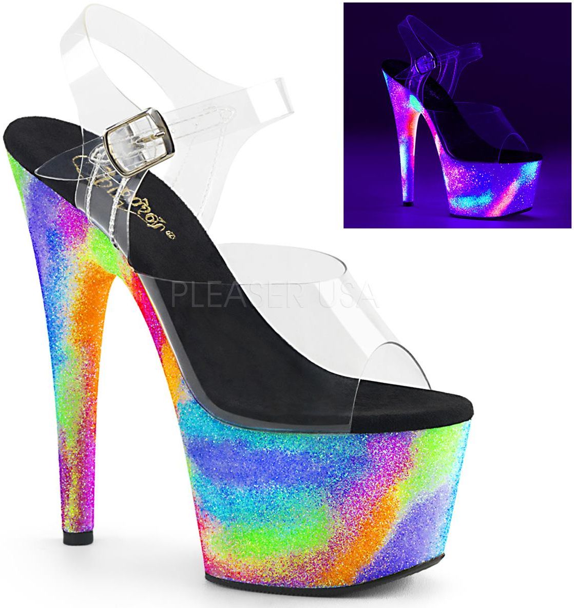 Jeśli chcesz bawić się modą i tworzyć zaskakujące stylizacje, w Twojej garderobie nie może zabraknąć butów od marki Pleaser. Wyjątkowe kolekcje nie tylko będą idealnym uzupełnieniem oryginalnych outfitów, ale także sposobem na wyrażenie swojej osobowości. Nie czekaj i postaw na wyjątkowy model FLAMINGO-808GXY od Pleaser! Buty FLAMINGO-808GXY dla kobiet z szaloną osobowością! Jesteśmy przekonani, że buty FLAMINGO-808GXY zachwycą Cię i skradną Twoje serce już od pierwszej sekundy. To sandałki na wysokiej, kolorowej platformie, która idealnie komponuje się z transparentną cholewką i czarną wkładką. Co warto wiedzieć o modelu FLAMINGO-808GXY? Unikalny model butów FLAMINGO-808GXY od marki Pleaser to idealna propozycja dla kobiet, które pasjonują się modą i chcą komponować modne zestawienia podkreślające kobiecy urok. Buty na 10-centymetrowej platformie i 20-centymetrowym obcasie będą odpowiednie dla na wiele różnych okazji. Możesz nosić je zarówno na co dzień, jak i na ważne wydarzenia. Obcasy Pleaser dostępne są w rozmiarach od 35 do 40.
