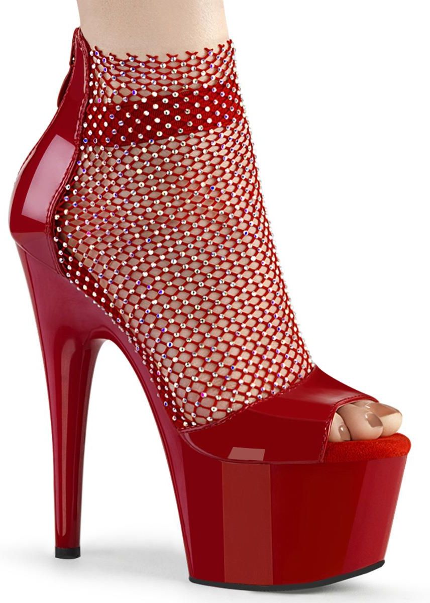 ADORE-765RM to wyjątkowo zaprojektowane sandałki w kolorze połyskującej czerwieni. Ich wyjątkowość polega na połączeniu eleganckich, błyszczących i wieczorowych sandałków z częściowym zasłonięciem stopy dopasowaną kolorystycznie, delikatną siateczką. Buty posiadają platformę, co znacznie ułatwia chodzenie na tak wysokiej szpilce. 7-centymetrowa platforma oraz 17,8-centymetrowy obcas w kształcie szpilki sprawiają, że Twoje nogi wydłużoną się aż do nieba! Dodatkowo półodkryta forma sandałków sprawia, że optycznie wydłużają je również o długość stopy. Wycięte palce pozwalają za to doskonale zaprezentować wieczorowy pedicure, zaś lekko zakryta pięta wpływa pozytywnie na stabilność poruszania się. Na części zakrywającej piętę znajduje się również dyskretny zamek błyskawiczny, który znacznie ułatwia zakładanie i zdejmowanie butów. Jak klasyczne sandałki, wyposażone są również w pasek na kostkę, stabilizujący przy chodzeniu. Te wyjątkowe sandałki w kolorze czerwonym dostępne są w rozmiarach od 35 do 42.