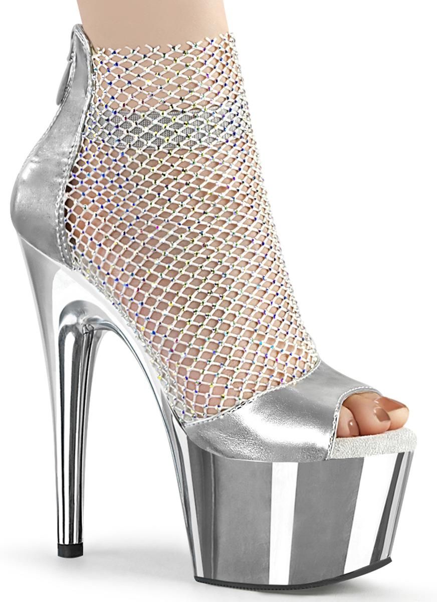 ADORE-765RM to wyjątkowo zaprojektowane sandałki w kolorze połyskującego srebra. Ich wyjątkowość polega na połączeniu eleganckich, błyszczących i wieczorowych sandałków z częściowym zasłonięciem stopy dopasowaną kolorystycznie, delikatną siateczką. Buty posiadają platformę, co znacznie ułatwia chodzenie na tak wysokiej szpilce. 7-centymetrowa platforma oraz 17,8-centymetrowy obcas w kształcie szpilki sprawiają, że Twoje nogi wydłużoną się aż do nieba! Dodatkowo półodkryta forma sandałków sprawia, że optycznie wydłużają je również o długość stopy. Wycięte palce pozwalają za to doskonale zaprezentować wieczorowy pedicure, zaś lekko zakryta pięta wpływa pozytywnie na stabilność poruszania się. Na części zakrywającej piętę znajduje się również dyskretny zamek błyskawiczny, który znacznie ułatwia zakładanie i zdejmowanie butów. Jak klasyczne sandałki, wyposażone są również w pasek na kostkę, stabilizujący przy chodzeniu. Te wyjątkowe sandałki w kolorze srebra dostępne są w rozmiarach od 35 do 42.