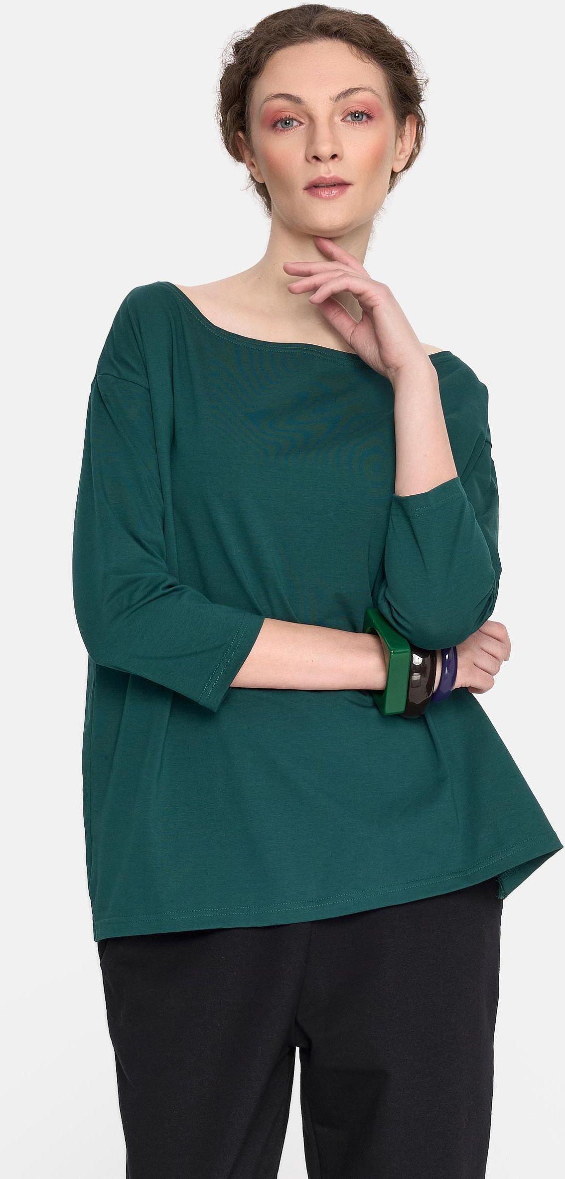 KOLOR: CIEMNY ZIELONY PASTELOWY Bawełna 94%, elastan 6% Elastyczna dzianina bawełniana. GRAMATURA: 185 G/M2 Poznaj model Olivia – bluzkę, która skradła serca naszych klientek i stała się absolutnym numerem jeden w naszej kolekcji. To fason, który udowadnia, że codzienna wygoda może iść w parze z wyjątkowym wdziękiem. Wykonana z wysokogatunkowej dzianiny bawełnianej z dodatkiem elastanu, idealnie dopasowuje się do rytmu Twojego dnia. Dlaczego Olivia to wybór naszych Klientek? Ikoniczny dekolt: To znak rozpoznawczy tego modelu. Szeroka, swobodna łódka pozwala na fantazyjne opuszczenie bluzki na jedno ramię. To detal, który dodaje stylizacji lekkości i kobiecego charakteru. Komfortowy rękaw: Rękaw o długości sięgającej okolic łokcia to idealne rozwiązanie – zapewnia optymalną osłonę ramion, a jednocześnie nadaje bluzce nowoczesny, "miejski" wygląd. Szczypta elastyczności: Dodatek elastanu sprawia, że bawełniana dzianina jest wyjątkowo sprężysta. Bluzka nie krępuje ruchów, świetnie układa się na każdej sylwetce i jest niezwykle odporna na zagniecenia. Subtelne detale: Delikatne, surowe wykończenie dekoltu oraz nasza “ćma” naszyta u dołu podkreślają autentyczność i casualowy rodowód tego modelu. Modelka ma 174 cm wzrostu i nosi rozmiar M. Wymiary (w centymetrach, mierzone na płasko): XS: szerokość w biuście 46, szerokość dołu 50, długość rękawa 38, długość całkowita 60, S: szerokość w biuście 53, szerokość dołu 54, długość rękawa 40, długość całkowita 62, M: szerokość w biuście 58, szerokość dołu 58, długość rękawa 41, długość całkowita 64, L: szerokość w biuście 60, szerokość dołu 62, długość rękawa 43, długość całkowita 66.