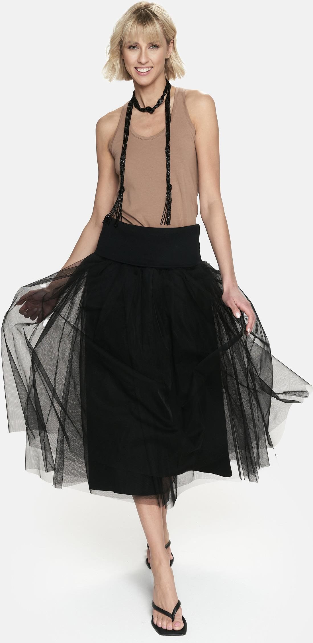 KOLOR: CZARNY Tiul: poliester 100% Podszewka: Bawełna 94%, elastan 6%. Tiulowa spódnica o długości do połowy łydki. Model składa się z kilku warstw lekkiego tiulu, które nadają całości zwiewności i subtelnego objętościowego efektu. Dodatkowy komfort zapewnia elastyczna gumka w pasie, która doskonale dopasowuje się do sylwetki. Zaprojektowana i uszyta w Polsce. • długość midi, • elastyczna gumka w pasie, • wszyta halka, • złożona z kilku warstw tiulu, • modelka ma 176 cm wzrostu i nosi rozmiar M. Wymiary (w centymetrach, mierzone na płasko): S: Szerokość elastycznego pasa 33, wysokość elastycznego pasa 26, długość całkowita 95, M: Szerokość elastycznego pasa 35, wysokość elastycznego pasa 26, długość całkowita 96, L: Szerokość elastycznego pasa 37, wysokość elastycznego pasa 26, długość całkowita 97.