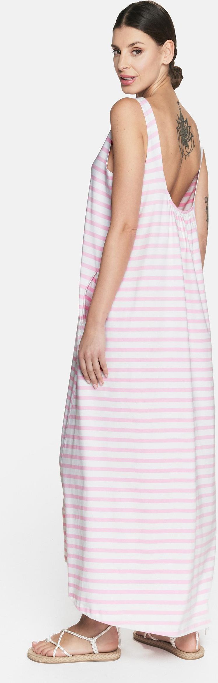 KOLOR: PASKI BIAŁO RÓŻOWE Bawełna 94%, elastan 6%. Cienka dzianina bawełniana. GRAMATURA: 180 G/M2 Długa letnia luźna sukienka na ramiączkach, która jest naszym prawdziwym bestsellerem. Ten minimalistyczny fason jest idealny na upalne lato, sprawdzi się również na wieczorne wyjście. Zaprojektowana i uszyta w Polsce. • mały dekolt z przodu i szerokie ramiączka, • duży dekolt z tyłu przymarszczony gumką, • krój w literę A, • kieszenie boczne, • lekko wydłużony tył, • modelka ma 176 cm wzrostu i nosi rozmiar M. WYMIARY (w centymetrach, mierzone na płasko): S: szerokość w biuście 45, szerokość dołu 71, długość całkowita 117/122, M: szerokość w biuście 48, szerokość dołu 75, długość całkowita 120/124, L: szerokość w biuście 52, szerokość dołu 81, długość całkowita 125/130.