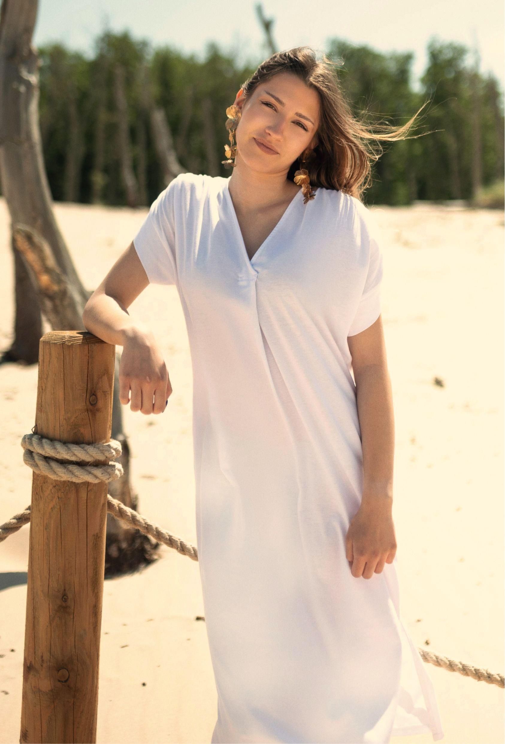 KOLOR: BIAŁY Bawełna 100% Cienka dzianina bawełniana. GRAMATURA: 150 G/M2 Swobodna, długa sukienka z dekoltem w kształcie litery V. Minimalistyczny, wygodny krój sprawdzi się zarówno na co dzień, jak i na wieczorne wyjścia. Zaprojektowana i uszyta w Polsce. • długość midi, • dekolt w literę V, • komfortowy krój z marszczeniami, • rozcięcie po lewej stronie, • krótkie, opadające rękawy, • kieszenie boczne, • modelka ma 176 cm wzrostu i nosi rozmiar M. Wymiary (w centymetrach, mierzone na płasko): S: szerokość w biuście 53, szerokość w biodrach 56, długość całkowita 120, M: szerokość w biuście 58, szerokość w biodrach 60, długość całkowita 122, L: szerokość w biuście 60, szerokość w biodrach 62, długość całkowita 124.