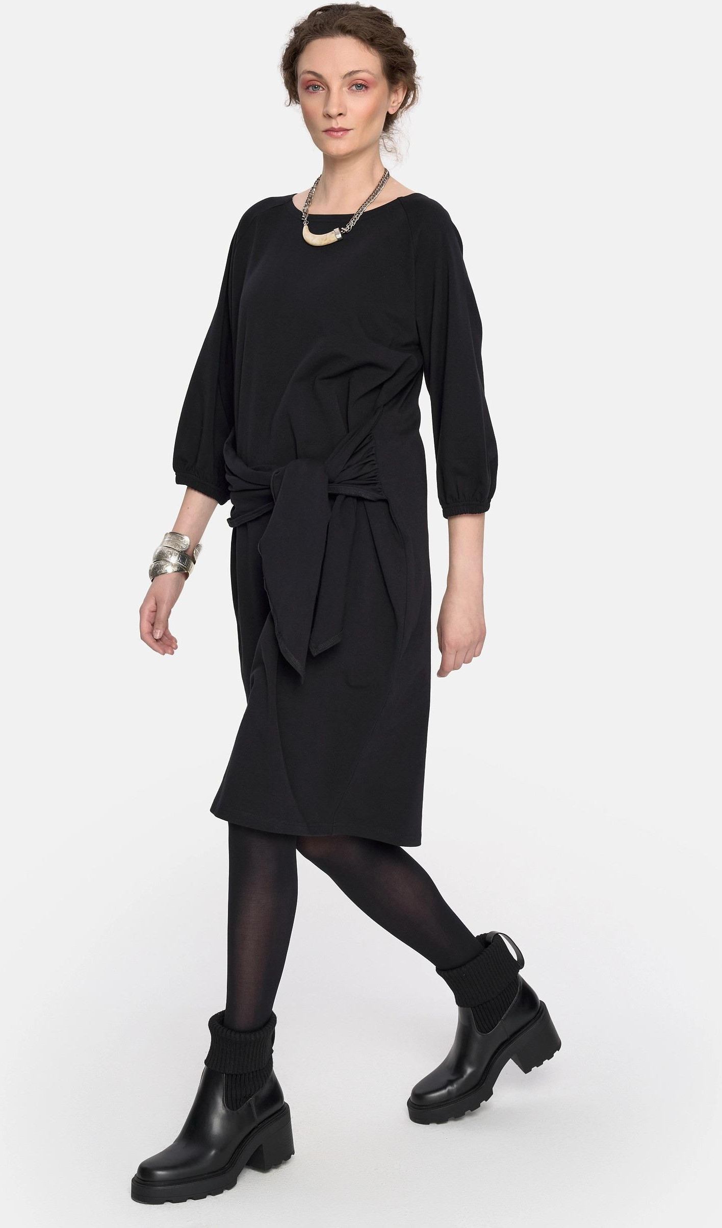KOLOR: CZARNY Bawełna 94%, elastan 6%. Elastyczna dzianina bawełniana. GRAMATURA: 210 G/M2 Sukienka z rękawem 3/4, uszyta z miękkiej i przyjemnej w dotyku dzianiny. Prosty krój został wzbogacony elastycznym wiązaniem w pasie, które podkreśla talię i pozwala dopasować fason do sylwetki. Zaprojektowana i uszyta w Polsce. • elastyczne wiązanie w pasie, • rękaw 3/4 z lekkim bufowaniem, • długość midi, • modelka ma 177 cm wzrostu i nosi rozmiar M. Wymiary/