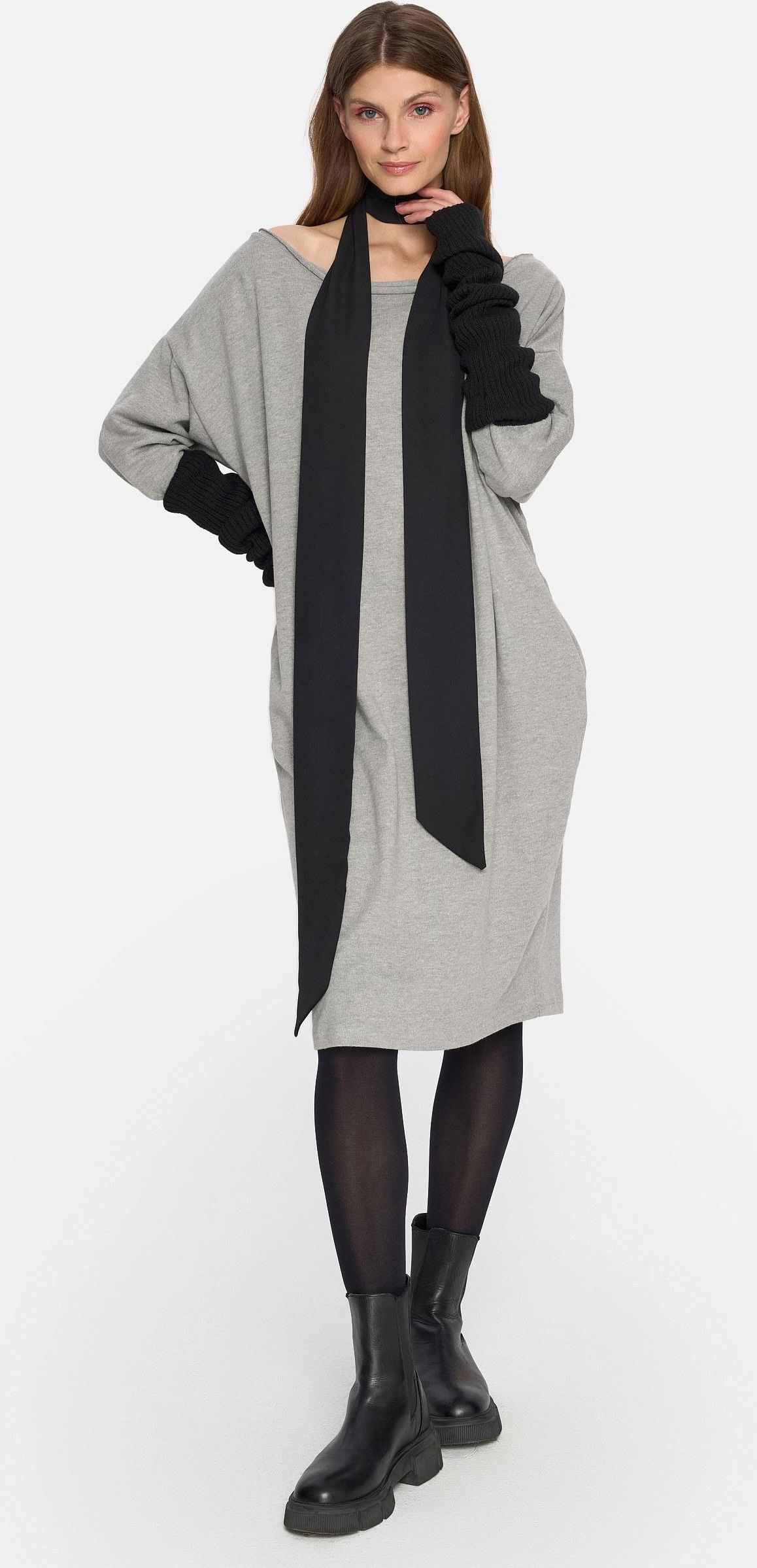 KOLOR: SZARY Bawełna 77%, poliester 20%, elastan 3%. Elastyczna dzianina. GRAMATURA: 190 G/M2 Sukienka oversize o długość midi, wykonana z sweterkowej dzianiny, w wersji z długim rękawem . Dekolt z ciekawym, podwójnym przeszyciem, w kształcie szerokiej łódki, lekko opadający z ramion. …