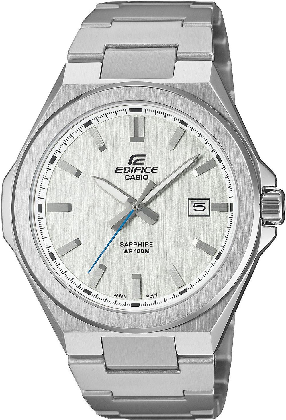 Casio Edifice Efb-108D-7Avuef Zegarek męski EFB-108D-7AVUEF pochodzi z gustownej i szykownej kolekcji stalowych zegarków z wyższej półki Casio. Wszystkie modele EDIFICE łączą w sobie zalety zegarka sportowego, wodoodpornego do głębokości 100m z designem zegarka eleganckiego. Zegarek męski CASIO EFB-108D-7AVUEF wyposażony jest w niezawodny mechanizm kwarcowy, którego dokładność chodu wynosi +/ 20 sekund w skali miesiąca oraz zapewniający działanie na jednej baterii nawet do 3 lat. Koperta oraz bransoleta wykonane są w całości z wysokiej jakości stali szlachetnej - odpornej na ścieranie. Na cyferblacie umieszczono datownik wskazujący dzień miesiąca umiejscowiony przy godzinie 3. Dodatkowo w zegarku zastosowano tzw. neobrite - czyli specjalną warstwę luminescencyjną na wskazówkach oraz indeksach, która po naświetleniu jest widoczna po zmroku. Tarcza nakryta została przez szkiełko szafirowe (9 punktów twardości w skali Mohsa) zapewniające ochronę przed zarysowaniami. Do zalet zegarka EFB-108D-7AVUEF możemy zaliczyć również wodoszczelność na poziomie 10ATM (100M), która pozwala na zanurzenie go w wodzie oraz specjalny zaczep zabezpieczający przed przypadkowym odpięciem bransolety. Specyfikacja: Mechanizm: Typ mechanizmu: Kwarcowy Kaliber mechanizmu: Casio 5664 Koperta: Wodoszczelność: 100 m (10 bar) Wysokość koperty z uszami: 48.0 mm Kolor koperty: Srebrny Materiał koperty: Stal Kształt koperty: Okrągła Zakręcany dekiel: Tak Szerokość koperty: 45 mm Grubość koperty: 9.0 mm Tarcza: Kolor tarczy: Srebrny Wskazanie czasu: Analogowe Neobrite: Tak Szkło: Rodzaj szkła: Szafirowe Pasek/bransoleta: Bransoleta Regulacja obwodu bransolety: Tak Zapięcie: Motylkowe Kolor paska/bransolety: Srebrny Materiał paska/bransolety: Stal Maksymalny obwód (koperta + pasek): 20.0 cm Funkcje: Datownik, Dzień miesiąca Pochodzenie: Japońskie Styl: Klasyczny Waga: 133.00 g Model: EFB-108D-7AVUEF