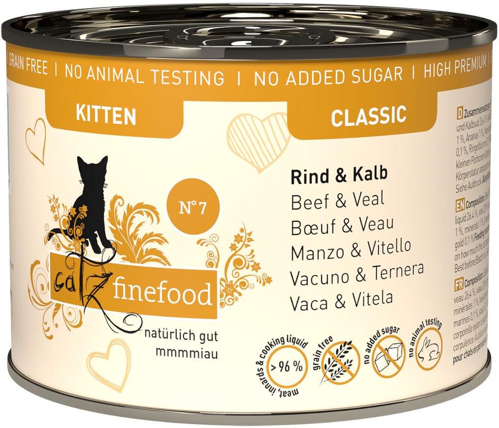 Catz Finefood Classic Kitten N.07 Wołowina i cielęcina puszka 200g Dostosowaliśmy nasze popularne przepisy z Catz Finefood do potrzeb rosnących kotów. Dzięki bardzo podobnym podstawowym przepisom mała aksamitna łapka jest już zaznajomiona ze smakiem, który odnajduje ponownie jako dorosły kot w Catz …