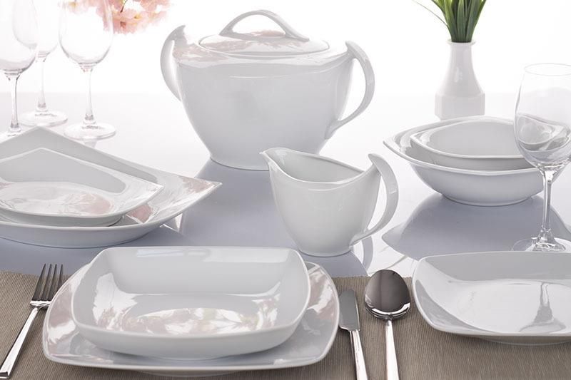 OPIS PRODUKTU: ĆMIELÓW AKCENT - Serwis obiadowy 45 części w kolorze białym na 12 osób Komplet obiadowy składa się z: - 12 sztuk - talerz obiadowy - średnica 25,5 cm - 12 sztuk - talerz głęboki do zupy - średnica 20,5 cm - 12 sztuk - talerz deserowy - średnica 20 cm - 2 sztuki - miska - średnica 21 cm, wysokość 6 cm, pojemność 600 ml - 2 sztuki - miska - średnica 16 cm, wysokość 5 cm, pojemność 350 ml - 1 sztuka - półmisek - dł. 29 cm x szer. 20,5 cm - 1 sztuka - półmisek - dł. 24,5 cm x szer. 17 cm - 1 sztuka - półmisek - dł. 33,5 cm x szer 22 cm - 1 sztuka - sosjerka - pojemność 350 ml - 1 sztuka - waza do zupy o pojemności 3 litrów Dodatkowe informacje: - całość pakowana w karton POSIADAMY W OFERCIE SERWIS KAWOWY W TYM SAMYM WZORZE