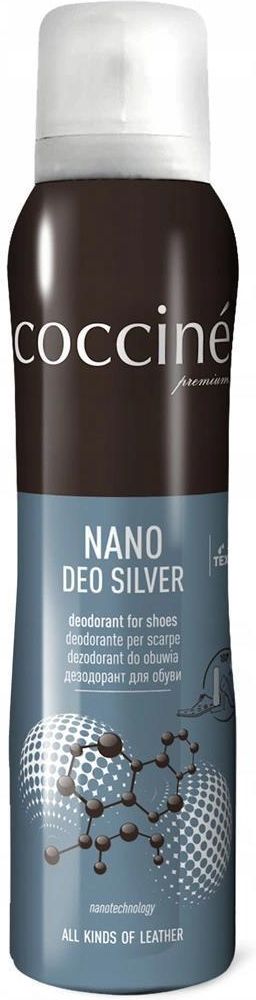 Coccine Nano Deo Silver Odświeżacz dezodorant do butów 400 ml Dezodorant odświeżający do obuwia. Dzięki zawartym w preparacie nano cząsteczką srebra i krzemionki, dezodorant jest bardzo skuteczny. Preparat świetnie sprawdza się do obuwia roboczego, sportowego oraz casualowego. Błyskawicznie wchłania wilgoć oraz zapobiega rozwoju bakterii. Dezodorant z łatwością odświeży Twoją ulubioną parę butów oraz pozostawi przyjemny zapach. Świetnie sprawdzi się do nowego obuwia, ale także do butów sportowych i na bardziej elegancką okazję. Sposób użycia: Wstrząsnąć pojemnikiem. Następnie rozpylić spray wewnątrz obuwia i pozostawić do wyschnięcia. Charakterystyka: Producent: Coccine Kolor: bezbarwny Forma: spray Funkcje: odświeżacz obuwia Pojemność: 400 ml H.