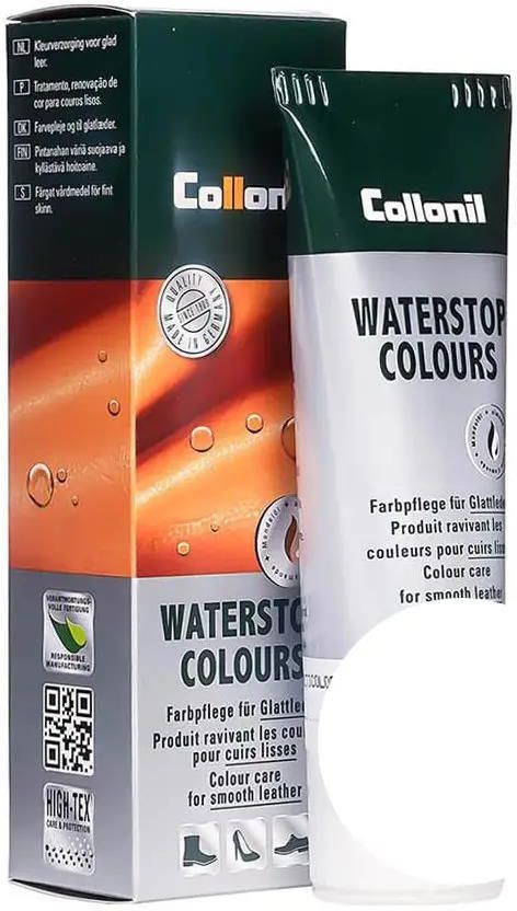 Collonil Waterstop Colours Pasta czarny błyszczący Collonil Waterstop Colours 75 ml Pasta impregnująca do butów Pasta impregnująca do obuwia ze skór gładkich. Intensywnie odświeża kolory i pielęgnuje skóry licowe. Chroni dodatkowo przed głęboko wnikającymi zabrudzeniami i wilgocią. Zawarty pigment koloryzujący pozwala na pokrywanie zadrapań, zarysowań i przebarwień. Zawiera olejek jojoba i olejek z migdałów, dzięki czemu skóra pozostaje miękka. Zachowuje przewiewność skóry i przepuszczalność membran. Zalecana do obuwia z membranami High Tech, takich jak Gore Tex i Sympatex. Dostępne kolory: bezbarwny, bezbarwny błyszczący, beżowy, biały, bordo, brązowy jasny, brązowy ciemny, brązowy średni, camel, ciemnoszary taupe, czarny, czarny błyszczący, czerwony ciemny, denim, granatowy, jeans, koniak, kremowy, multikolor, naturalny, niebieski ciemny, off white, oliwkowy, scotch, szary dym smoke, szary ciemny, szary jasny, szary średni.