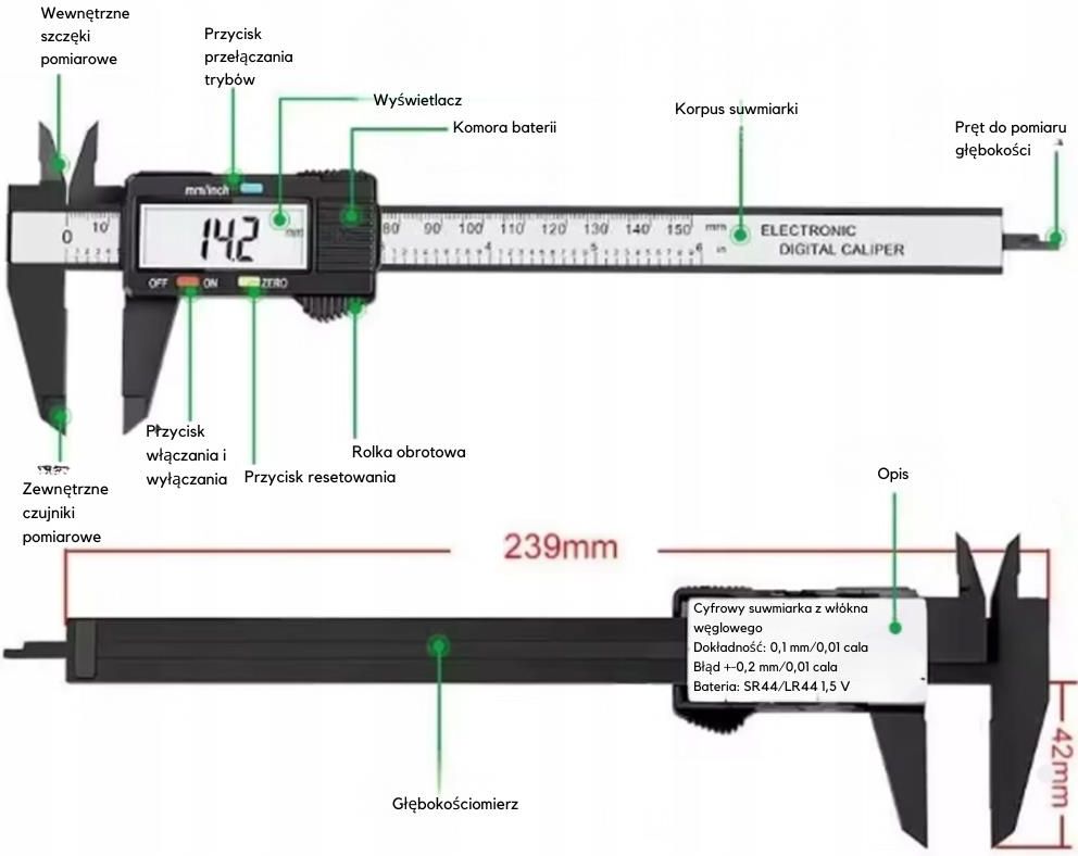 Suwmiarka cyfrowa 150 mm z włókna węglowego – precyzyjne narzędzie pomiarowe 0,1 mm Cyfrowa suwmiarka 150 mm to nowoczesny przyrząd pomiarowy, który łączy dokładność, wygodę i niezawodność w codziennej pracy. Dzięki wyraźnemu wyświetlaczowi LCD odczyt wyników jest szybki i prosty, bez konieczności skupiania wzroku na tradycyjnej skali. To doskonałe narzędzie zarówno do zastosowań profesjonalnych, jak i hobbystycznych. Lekka i poręczna, wykonana z trwałego włókna węglowego, sprawdzi się w warsztacie, pracowni czy w domowym użyciu. Zakres pomiaru 0–150 mm pozwala na szerokie zastosowanie w różnych dziedzinach. Uniwersalne zastosowanie suwmiarki elektronicznej Elektroniczna suwmiarka 150 mm znajduje zastosowanie w wielu branżach i dziedzinach. W inżynierii i przemyśle metalowym umożliwia precyzyjną kontrolę detali, w jubilerstwie pozwala mierzyć najdrobniejsze elementy, a w laboratoriach i medycynie wspiera dokładne analizy. Dzięki swojej funkcjonalności przyrząd pozwala mierzyć średnice wewnętrzne i zewnętrzne, głębokość oraz długość. Funkcja zerowania w dowolnym punkcie ułatwia porównywanie wyników, a duży ekran LCD zapewnia natychmiastowy i czytelny odczyt. Najważniejsze zalety cyfrowej suwmiarki Ten precyzyjny przyrząd pomiarowy wyróżnia się funkcjonalnością i wygodą obsługi. Największe atuty to: Wysoka dokładność – precyzja do 0,01 mm. Zakres pomiarowy 0–150 mm – do różnych zastosowań. Wyświetlacz LCD – szybki i czytelny odczyt wyników. Funkcja zerowania – możliwość ustawienia punktu odniesienia w każdej pozycji. Lekki i wytrzymały korpus z włókna węglowego. Szybkość pracy – natychmiastowe wyświetlanie pomiarów. Uniwersalne wykorzystanie – od warsztatu, przez laboratorium, po domowe majsterkowanie. Gdzie sprawdzi się suwmiarka TSG-131? Cyfrowa suwmiarka elektroniczna to narzędzie dla inżynierów, majsterkowiczów, studentów i naukowców. Doskonale sprawdzi się w warsztacie, podczas napraw, w jubilerstwie, a także w codziennym użytku domowym. To połączenie dokładności klasycznej mechaniki i wygody elektroniki, które gwarantuje niezawodne pomiary w każdej sytuacji.