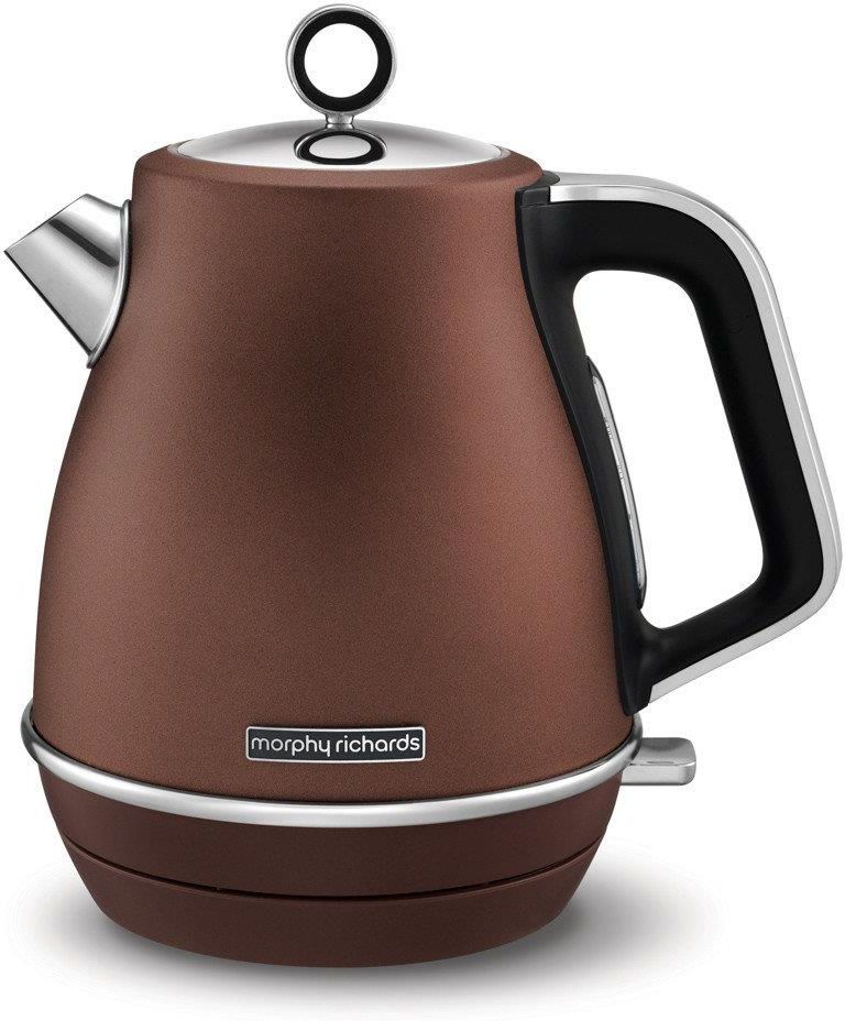 Morphy Richards Evoke Jug Morphy Richards to znana brytyjska marka z wielowiekowym doświadczeniem. Od zawsze zachwycała niezwykłyym designem swoich produktów, a także ich wysoką funkcjonalnością. Czajnik EVOKE to idealny przykład nowoczesnego wzornictwa o retro charakterze - obłe, delikatne kształty nawiązują do stylistyki vintage, jednak funkcjonalności sprzętu przewyższają większość AGD na rynku.  Zalety produktu. Dlaczego warto? Ergonomiczny kształt czajnika ułatwiający korzystanie z niego Wyciągany, łatwy do czyszczenia filtr antywapienny Obrotowa podstawka 360º ze schowkiem na przewód Posiada zabezpieczenie przed przegrzaniem Podświetlany przycisk on/off Duża pojemność - 6 szklanek napoju za jednym gotowaniem Cechy charakterystyczne  Czajnik EVOKE pochodzi z serii o tej samej nazwie, w której znaleźć można kuchenne sprzęty o delikatnej stylistyce retro i mocnych kolorach. Czajnik o mocy 2,2 kW i pojemności 1,5l posiada wygodną podstawę 360 z przewodem na schowek. Wyposażony został we wskaźnik poziomu wody i - dla maksymalnego bezpieczeństwa użytkowania - ochronę przed przegrzaniem. Elegancki brązowy kolor podkreśla retro estetykę produktu. Materiał Czajnik EVOKE wykonany został ze stali nierdzewnej. Posiada także wygodny uchwyt i wyjmowany filt kamienia, dzięki któremu będziesz cieszyć się nienaganną pracą produktu przez wiele sezonów.