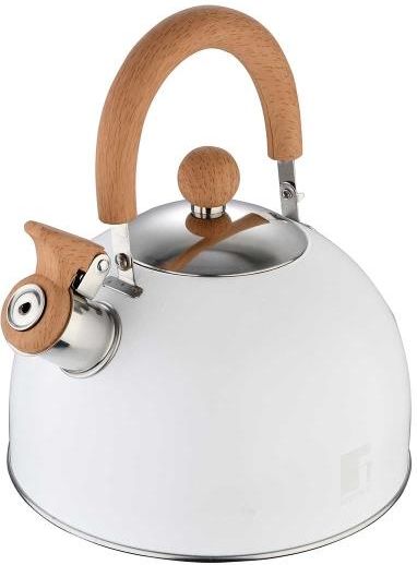 Stalowy czajnik z gwizdkiem wykonany z wysokiej jakości stali nierdzewnej. Stanowi bardzo dekoracyjny element każdej kuchni. Czajnik został skonstruowany tak, by w jak najkrótszym czasie doprowadzić gotowaną wodę do temperatury wrzenia. Szybsze gotowanie pozwala na zaoszczędzenie energii, co za tym idzie oszczędzasz też pieniądze. Rączka wykonana z tworzywa powlekanego cienką warstwą silikonu (soft touch) imitującego drewno. Cechy Wykonany z wysokiej jakości stali nierdzewnej lakierowanej na kolor biały. Odpowiedni dla wszystkich źródeł gotowania (także indukcja). Funkcja gwizdania, gwizdek zintegrowany, podnoszony. Specjalnie zaprojektowany do łatwego użytkowania. Nienagrzewający się uchwyt Pojemność: 2,3l (użytkowa 2l) Średnica dna: 19 cm