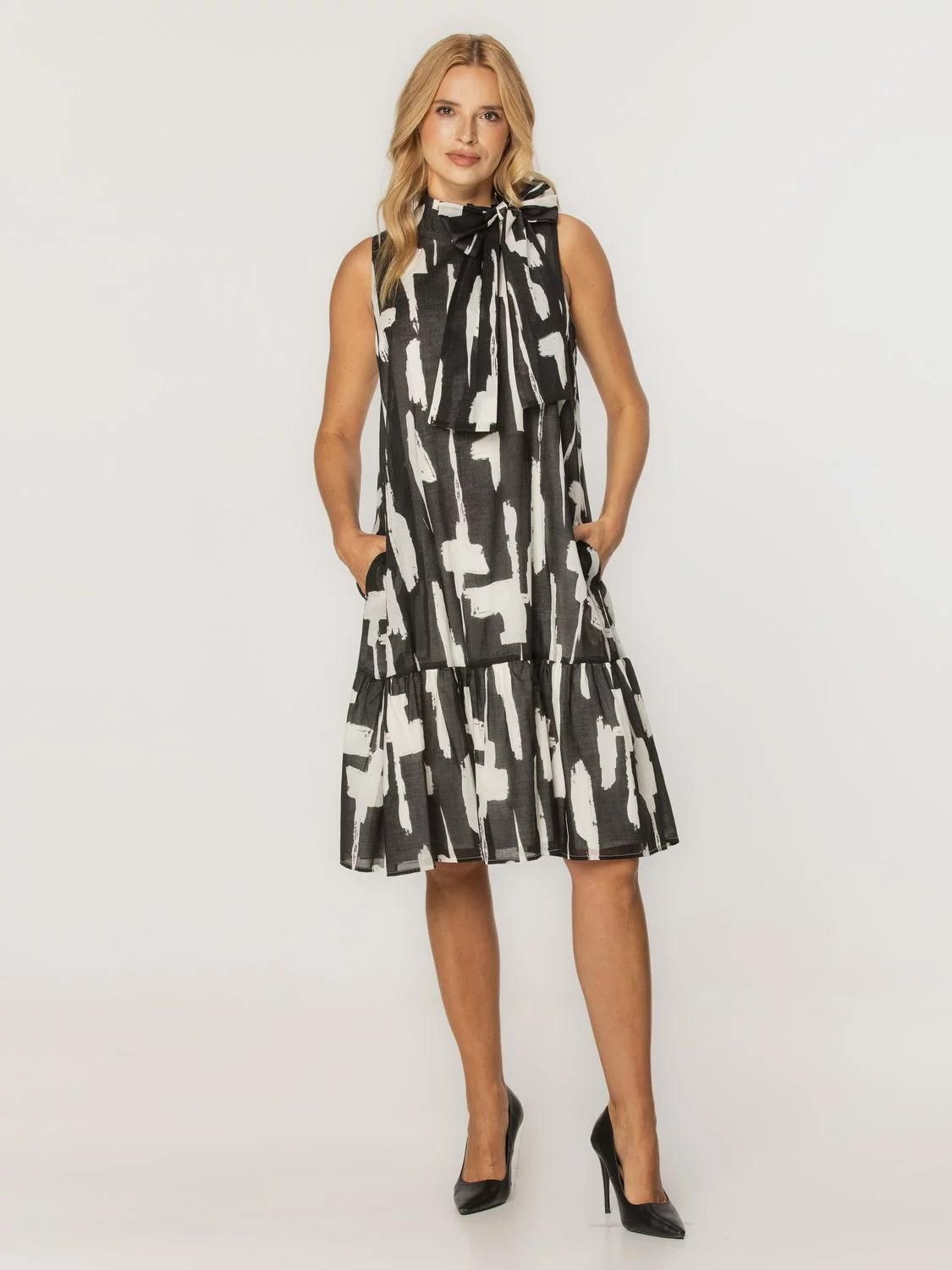 Luźna sukienka bez rękawów Letnia sukienka bez rękawów, z ozdobną kokardą z przodu, wycięciem na plecach i praktycznymi kieszeniami. Dzięki lekkiemu materiałowi i wszytej podszewce, sukienka świetnie sprawdzi się nie tylko w casualowej stylizacji urlopowej, ale również biurowej. Kolor główny: czarne i białe maziaje Rodzaj sukienki: luźna, długość MIDI Skład tkaniny wierzchniej: 100% bawełna Skład podszewki: 98% poliester, 2% elastan Wykończenia: kokarda, wycięcie na plecach, ukryte kieszenie Gwarancja: 24 m-ce Uszyto w Polsce