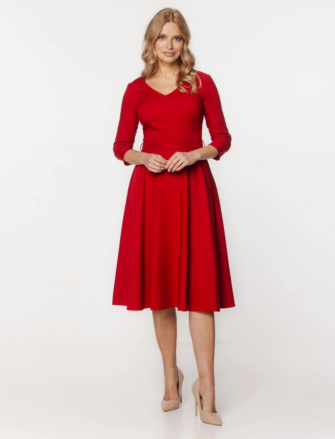 Rozkloszowana sukienka MIDI Elegancka sukienka MIDI z rozkloszowanym dołem i dekoltem w serek (typu V). Sukienka posiada rękaw 3/4 i jest zapinana na plecach za pomocą zamka błyskawicznego. Charakterystycznymi cechami tego modelu są dwie kieszenie oraz pasek, który można wiązać na wiele sposobów. Sukienka świetnie kamufluje niedoskonałości figury, a dzięki paskowi w talii tworzy piękną, klepsydrową sylwetkę. Kolor główny: czerwona o gładkiej fakturze Długość rękawów: 3/4 Rodzaj sukienki: rozkloszowana, długość MIDI, dekolt w serek (typu V) Skład tkaniny wierzchniej: 37% wiskoza, 59% poliester, 4% elastan Skład podszewki: 94% poliester, 6% elastan Wyprodukowano w Polsce Gwarancja: 24 m-ce