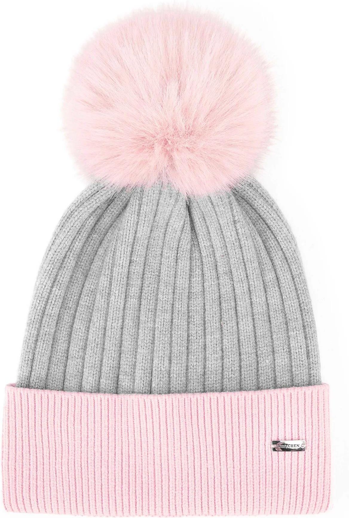 Damska czapka z futerkowym pomponem szaro - różowa Warszawa