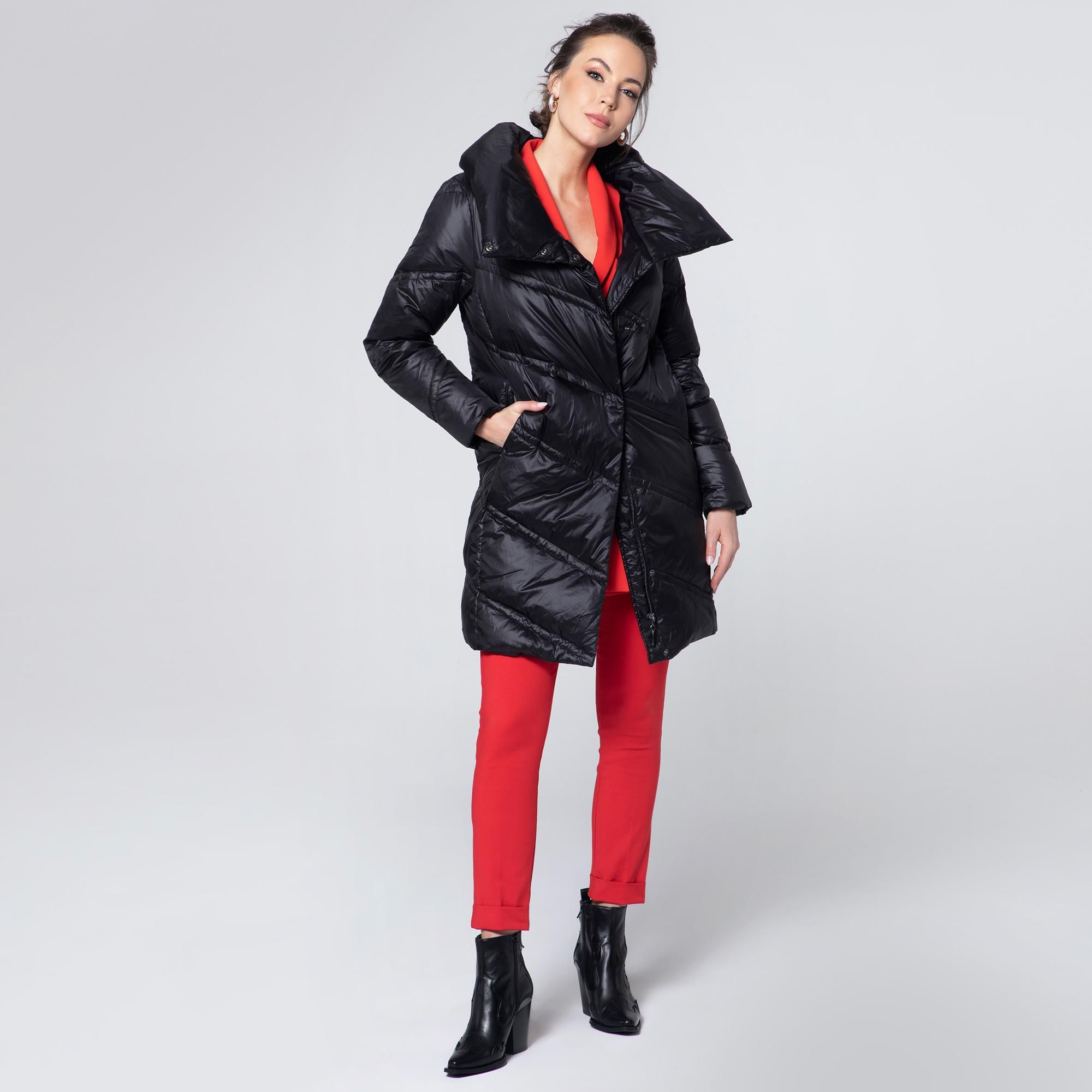 Damska kurtka puchowa. Otulająca niczym kokon puchowa kurtka na jesień i zimę. W środku wypełniona jest puchem z dodatkiem pierza, które zapobiega zbijaniu się. Taka mieszanka doskonale izoluje od zimna. Będzie Ci jeszcze cieplej, jeśli postawisz i zapniesz na zatrzaski wysoki kołnierz. Zwróć również uwagę na lekki połysk wysokogatunkowego nylonu oraz efektowne przeszycia, dzięki którym kurtka zyskuje na stylu. Boczne kieszenie są doskonałym miejscem na schowanie dłoni. Ta damska puchowa kurtka z wysokim kołnierzem otuli Cię w chłodne miesiące.Nasza rada:fason kokonu to doskonały wybór do obcisłych spodni czy getrów. 100% nylon; wypełnienie: 70% puchu, 30% pierza; podszewka: 100% poliester; wysoki zapinany na zatrzaski kołnierz; kurtka zapinana na suwak i dodatkowo na kryte zatrzaski – zapięcie jest zasłonięte.