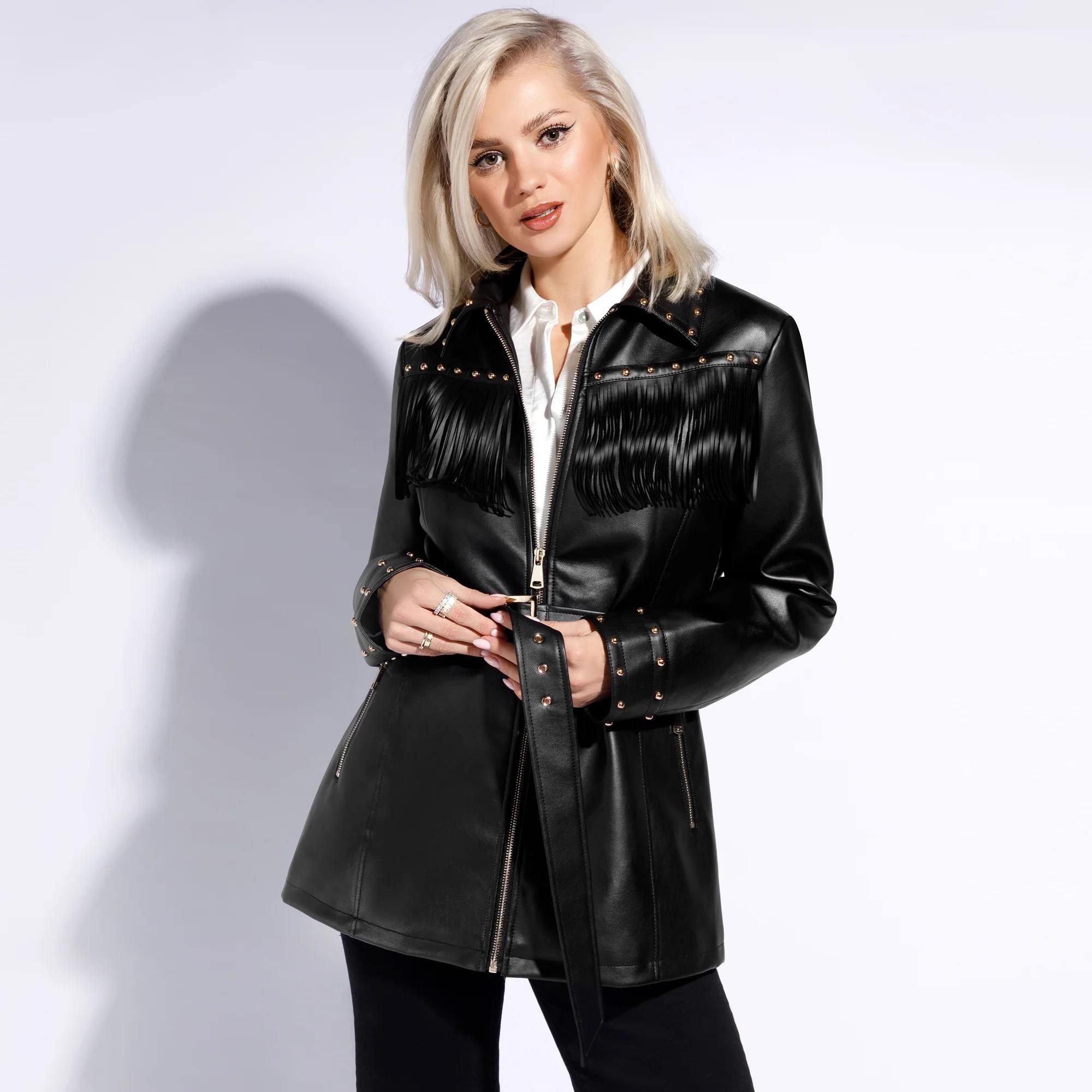 Opinie Damska kurtka z ekoskóry z frędzlami i nitami
