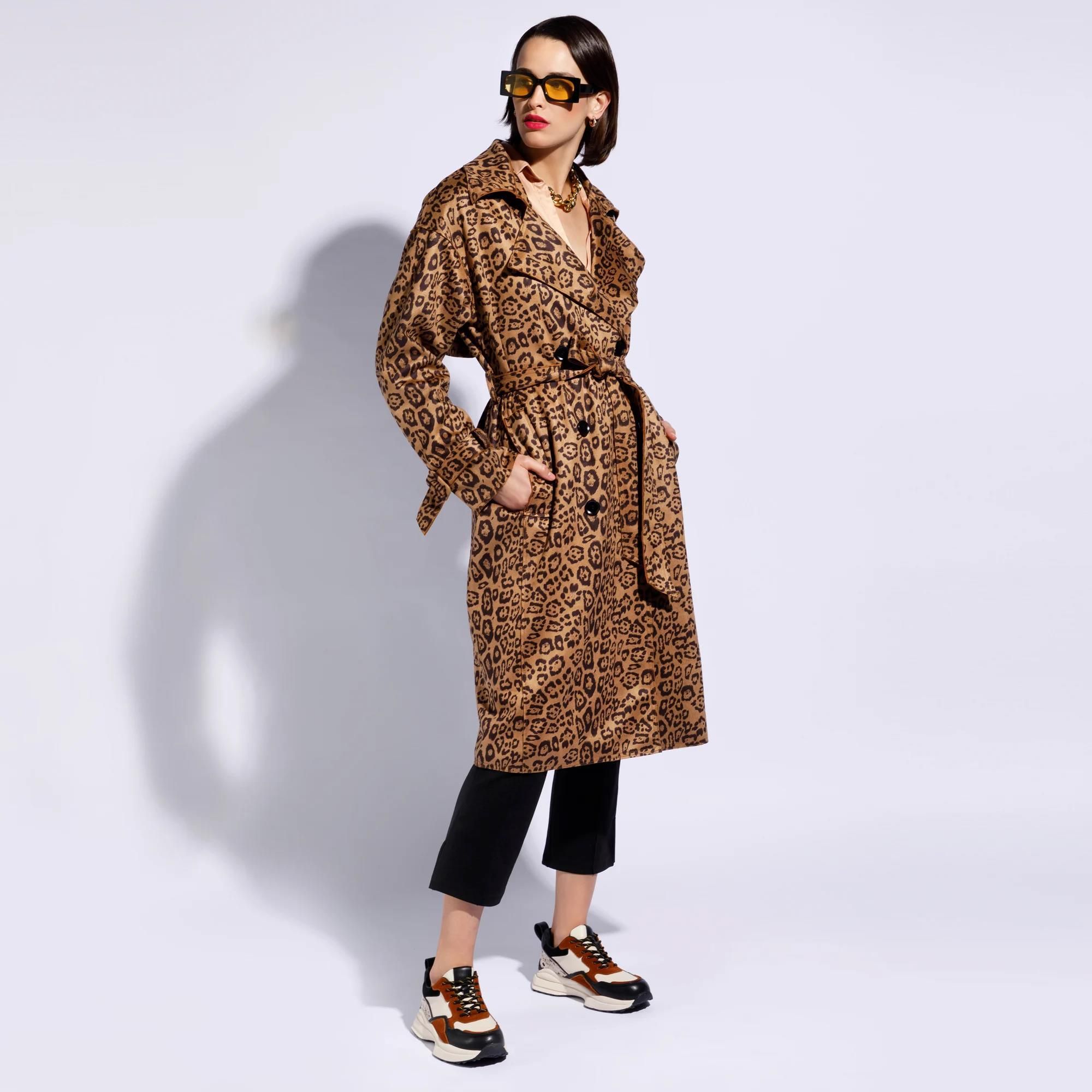 Designerski trencz damski w szałowych kolorach. Niezależnie od wieku i stylu, każda kobieta powinna posiadać w szafie płaszcz dwurzędowy z paskiem. Brzmi banalnie? Nie musi, bowiem najmodniejsze modele mają zwierzęce wzory! Z tak oryginalnym nadrukiem nawet najprostszy i najbardziej klasyczny model zyskuje na wyglądzie. Piękny design to nie wszystko – regulowane paski na rękawach, liczne przeszycia oraz długi karczek z tyłu nadają mu dodatkowego, niezapomnianego uroku. A miękki, przyjemny w dotyku materiał nie krępuje ruchów i ładnie układa się na ciele. Zapięty na guziki czy przewiązany paskiem – damski płaszcz dwurzędowy w zwierzęce wzory wygląda świetnie zawsze i wszędzie! Nasza rada: Lubisz oryginalne połączenia stylów? Włóż płaszcz w zwierzęce wzory do sportowego obuwia typu sneakersy damskie i czuj się komfortowo niezależnie od okazji! materiał: 100% poliester, podszewka: 100% poliester, luźna konstrukcja, nisko wszyte rękawy, ukośne kieszenie z zakładkami, liczne przeszycia na całej długości płaszcza, regulowane paski na końcach rękawów, dwa rzędy guzików, prosty, regulowany pasek z klamrą, długi karczek z tyłu, modny, zwierzęcy nadruk.