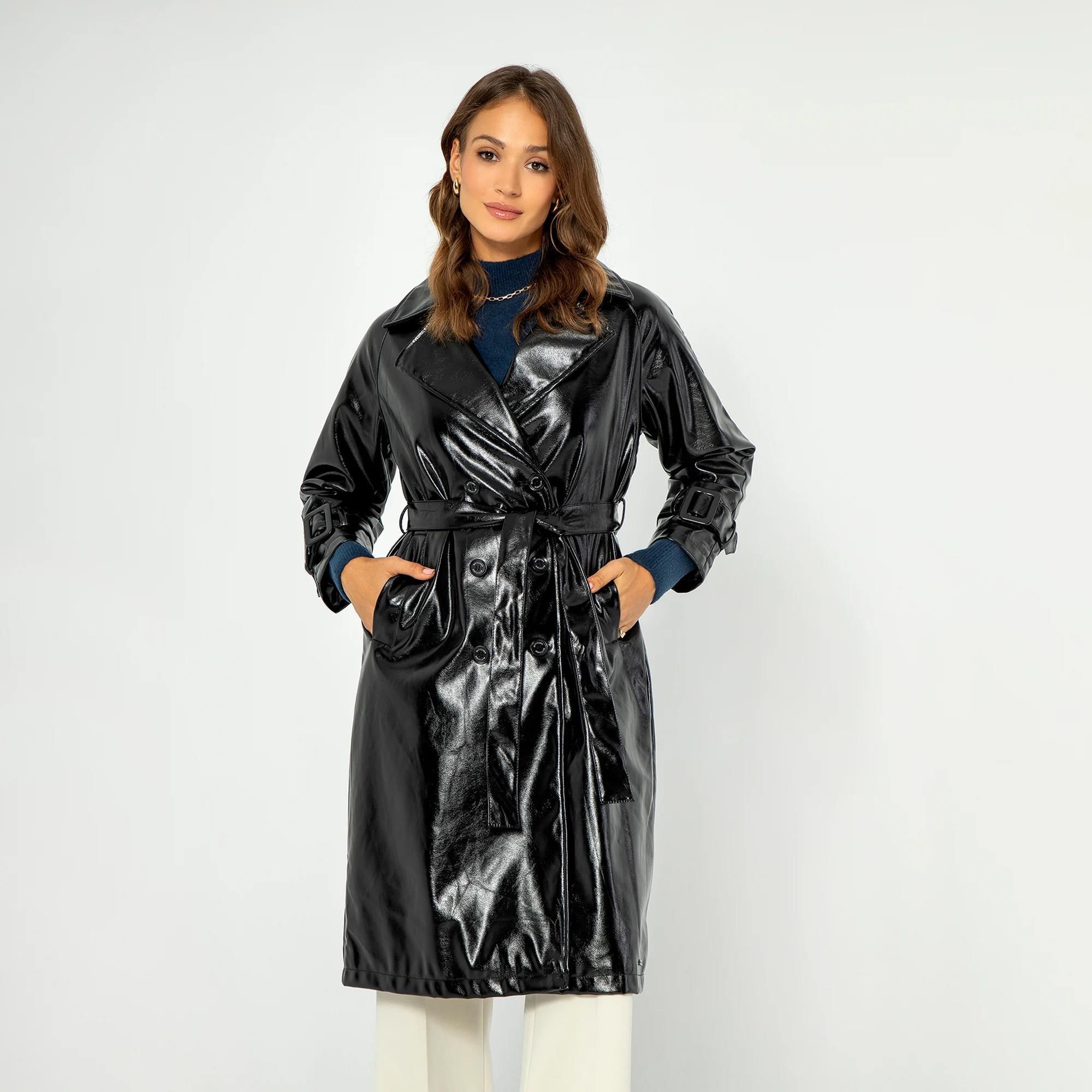 Dwurzędowy płaszcz z regulowanym paskiem Zanurz się w świecie nowoczesnego szyku i komfortu z naszym dwurzędowym płaszczem z ekoskóry. Ten wyjątkowy model łączy w sobie elegancję, funkcjonalność oraz aktualne trendy, stając się niezbędnym elementem każdej zimowej garderoby. Dla kogo? Doskonały wybór dla kobiet, które pragną wyróżniać się w tłumie, nie rezygnując z wygody. Doskonale sprawdzi się zarówno w pracy, jak i podczas weekendowych wyjść czy wieczornych spotkań. Nasza rada: Na zimowe dni doskonale sprawdzi się zestawienie płaszcza z elegancką sukienką oraz wysokimi kozakami. Całość dopełnij klasycznym szalikiem. Kluczowe cechy: Krój: Klasyczny fason z dwoma rzędami guzików sygnowanych logo producenta zapewnia elegancki i ponadczasowy wygląd. Lekko oversizowy fason jest idealny dla osób ceniących sobie swobodę ruchów i nowoczesny, casualowy styl. Materiał: Wysokiej jakości ekoskóra nie tylko wygląda luksusowo, ale jest również praktyczna i odporna na zmienne warunki atmosferyczne. Podszewka z poliestru gwarantuje wygodę noszenia oraz dodatkowe ciepło w chłodne dni. Design: Stylowy, szeroki kołnierz nadaje charakter i podkreśla elegancję płaszcza, a długi karczek z tyłu dodaje płaszczowi wyjątkowego uroku i klasy. Praktyczność: Ukośne kieszenie na przodzie są wystarczająco przestronne, aby pomieścić drobne akcesoria, takie jak telefon czy klucze. Komfort noszenia: Dodatkowa zakładka z tyłu zapewnia większą swobodę ruchów, co sprawia, że płaszcz jest niezwykle komfortowy. Detale: Regulowane mankiety z klamrą pozwalają na dopasowanie do indywidualnych potrzeb oraz dodają nowoczesnego akcentu. Pasek umożliwia precyzyjne dopasowanie płaszcza według własnych preferencji. Delikatny akcent: Logo producenta subtelnie umieszczone po lewej stronie płaszcza. Dodaj go do swojej kolekcji i ciesz się elegancją oraz komfortem przez cały sezon!