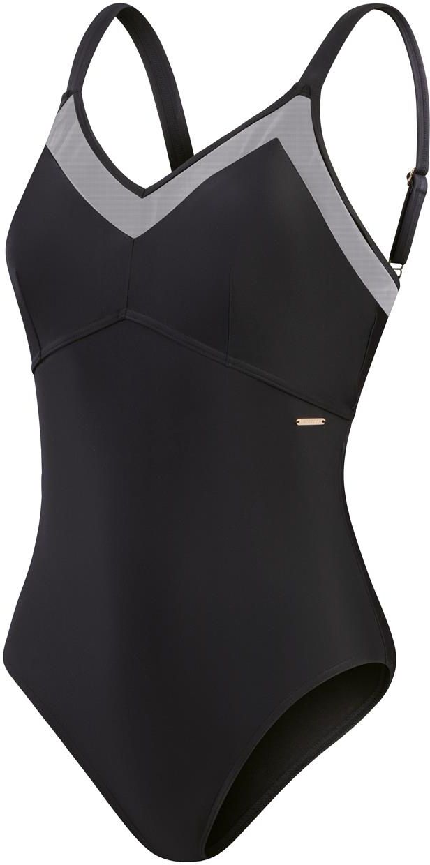 Pochlebny i stylowy czarny strój kąpielowy Shaping wykorzystuje prześwitujące panele z siateczki, wysokiej jakości materiał modelujący i dekolt w kształcie litery V, aby wydłużyć sylwetkę, podkreślając jej kształt. Złote logo podkreśla plażowy wygląd, a zapięcie z tyłu i regulowane ramiączka zapewniają wygodę i bezpieczeństwo. Konstrukcyjne szwy i wyjmowane wkładki biustonosza zapewniają kształt i wsparcie biustu. Zrobiony z wysokiej jakości, wygodnego materiału modelującego sylwetkę, który wygładza i modeluje ciało, jest idealny na plażę lub basen. Oferując wyższą odporność na chlor niż standardowe tkaniny na stroje kąpielowe, materiał pasuje jak nowy przez dłuższy czas dzięki CREORA® HighClo ™. Przędza nylonowa w tkaninie modelującej jest również wykonana w 100% z odpadów przedkonsumenckich, takich jak odpady z fabryk. Dekolt w kształcie litery V z siateczkowym panelem i zapięciem na zatrzask z tyłu Wsparcie biustu dzięki konstrukcji szwów i wyjmowanym wkładkom biustonosza Regulowane ramiączka w połączeniu z zapięciem na zatrzask z tyłu dla lepszego dopasowania Wysokiej jakości tkanina modelująca sylwetkę - idealna na plażę lub basen Wyższa odporność na chlor niż standardowe tkaniny na stroje kąpielowe - dłużej jak nowe dzięki CREORA® HighClo™ Materiał: 74% poliamid z recyklingu, 26% elastan (Creora® HighClo)