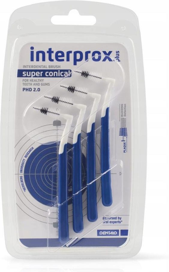 Dentaid INTERPROX Plus 2,00mm SUPER szczoteczki międzyzębowe granatowe INTERPROX Plus szczoteczki międzyzębowe Dentaid VITIS Szczoteczki międzyzębowe INRERPROXPlus przeznaczone są do usuwania biofilmu i resztek pokarmu z przestrzeni międzyzębowych. Specjalnie zaprojektowany kształt szczoteczki INTERPROX Plus oraz włókna Tynex® sprawiają, że szczoteczki doskonale dopasowują się do kształtu przestrzeni międzyzębowych zwiększając efektywność oczyszczania. Szczoteczki Dentaid INTERPROX Plus występują w dwóch formach, o cylindrycznym kształcie szczoteczki oraz stożkowym. Główki cylindryczne, o równej długości włókien na całej długości szczoteczki, przeznaczone są do oczyszczania przednich przestrzeni międzyzębowych. Końcówki stożkowe, których długość włosia wydłuża się od wierzchołka ku nasadzie szczoteczki, lepiej doczyszczają tylne przestrzenie międzyzębowe. Ergonomiczny uchwyt szczoteczek międzyzębowych NTERPROX Plus zapewnia pewny uchwyt i prawidłowe czyszczenie. Dłuższy uchwyt oraz odpowiednie wygięcię w znacznym stopniu ułatwia oczyszczanie przestrzeni międzyzębowych w tylnych partiach łuku zębowego. Każda szczoteczka w zestawie posiada ochronne etui, które zapewnia higieniczne przechowywanie szczoteczki. Innowacyjne włókna Tynex® nie podrażniają dziąseł podczas czyszczenia. Włosie szczoteczek międzyzębowych INTERPROX Plus jest wyjątkowo elastyczne dzięki czemu bardzo dobrze dopasowuje się do przestrzeni międzyzębowych dokładnie usuwają płytkę nazębną. Włókna w szczytowej partii szczoteczki są w kolorze białym dla lepszego zidentyfikowania krwawienia, włókna w kolorze czarnym znajdujące się w dolnej części główki wizualizuje biofilm. Drut szczoteczki międzyzębowej Dentaid INTERPROX Plus wykonany jest ze stali nierdzewnej powleczonej poliuretanem aby jeszcze lepiej chronić dziąsła i zęby przed podrażnieniem. Zastosowania dla szczoteczek międzyzębowych Dentaid INTERPROX Plus Szczoteczki międzyzębowe Dentaid INTERPROX Plus dzięki elastycznym włóknom dokładnie wymiatają płytkę nazębną z przestrzeni międzyzębowych. Różnorodność rozmiarów pozwala zarówno dokładnie i bezpiecznie doczyszczać ciasne przestrzenie międzyzębowe jak również szerokie, w tym miejsca po usunięciu zęba. Stożkowy kształt kilku rozmiarów szczoteczek międzyzębowych Dentaid INTERPROX Plus doskonale oczyszczają zęby podczas leczenia ortodontycznego. Szczoteczki doczyszczają także elementy stałego aparatu ortodontycznego pozwalając utrzymać aparat w czystości. Dzięki osłonce (etui) w sposób higieniczny można przenosić szczoteczki i używać zawsze i wszędzie. Jest to niezwykle pomocne narzędzie podczas noszenia aparatu ortodontycznego. Szczoteczki międzyzębowe Dentaid w dokładny i bezpieczny sposób czyszczą miejsca w okolicy implantów. Miejsca te wymagają specjalnej opieki i właściwej higieny gdyż podczas szczotkowania klasyczna szczoteczka do zębów nie usuwa płytki nazębnej i resztek pokarmów. Szczoteczki INRERPROX Plus dzięki elastycznym włóknom Tynex® oraz powlekanemu drutowi są bezpieczne dla dziąseł i uzupełnień protetycznych. INTERPROX Plus są bezpieczne w oczyszczaniu mostów i stałych wypełnień protetycznych. Dzięki możliwości formowania uchwytu w kilku miejscach szczoteczki jeszcze lepiej docierają w miejsca trudnodostępne w bezpieczny sposób usuwając płytkę nazębną i resztki pokarmów. Są w pełni bezpieczne i skuteczne w oczyszczaniu miejsc furkacji, które również narażone są na pojawianie się stanów zapalanych powodowanych zalegającą płytkę nazębną. Szczoteczki międzyzęnowe Dentaid INTERPROX Plus spełniają normę ISO 16409. Szczoteczki międzyzębowe należy wymieniać wówczas gdy włosie ulegnie zniszczeniu a także gdy rdzeń stracił swoją sztywność. W opakowaniu znajdują się 4 szczoteczki międzyzębowe Dentaid INTERPROX Plus w rozmiarze 2,00mm SUPER (granatowe). EAN