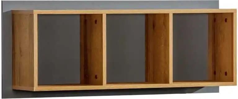 Półka wisząca WERSO W12 Kolekcja WERSO została zaprojektowana w połączeniu trzech kolorów: Biały + Antracyt oraz Dąb Riviera. Kolorystyka jest bardzo oryginalna a jednocześnie uniwersalna, więc idealnie wkomponuje się w aranżację większości pomieszczeń. WERSO składa się z dwunastu funkcjonalnych brył, dzięki którym zagospodarujemy wnętrze salonu, sypialni lub pokoju młodzieżowego. Drewniane nóżki dodają lekkości, co sprawia, że nawet w niewielkich pomieszczeniach będą prezentować się bardzo dobrze. Meble zostały wykonane z wysokiej jakości płyty meblowej, dzięki czemu posłużą przez długie lata. Wymiary Szerokość: 104,5 cm Głębokość: 23,6 cm Wysokość: 41,2 cm Dostępny kolor Antracyt + Dąb riviera