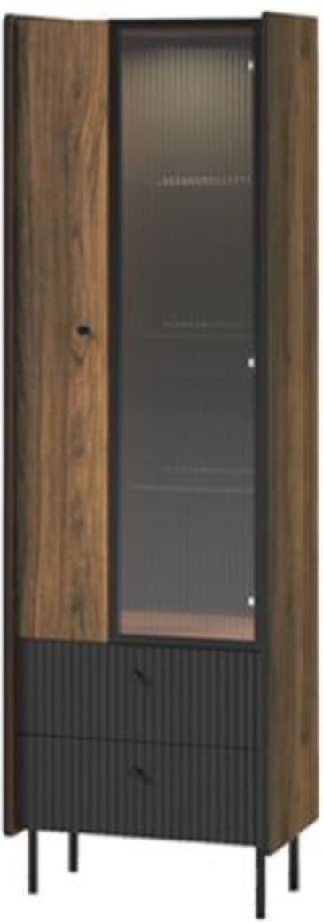 Witryna do salonu z kolekcji Prestigo polskiej marki Dolmar stworzy wyjątkowy design w Twoim wnętrzu.Przeszklona witryna z półkami i szufladami z ryflowanymi frontami sprosta wymaganiom nawet najbardziej wymagających.Modna kolorystyka san sebastian, czarny i orzech warmia wprowadza do wnętrza nutę wyrafinowania i luksusu.Przemyślane wnętrze witryny pozwoli na zachowanie porządku i wyeksponowanie wartościowych dla nas przedmiotów.Mebel z łatwością dopasujesz do wnętrza dzięki przemyślanej kolorystyce.Model wykonany z płyty laminowanej, z zabezpieczonymi obrzeżami ABS.Ryflowane fronty dodają wyrafinowanego charakteru, podkreślając prestiż kolekcji.Zastosowanie metalowych, wysokich czarnych metalowych nóg dodaje meblowi lekkości, a uchwyty ułatwiają otwieranie i zamykanie szafek.Szuflady wyposażone są w prowadnice kulkowe, co zapewnia płynność użytkowania i trwałość.Wymiary: Szerokość: 59 cmWysokość: 190,7 cmGłębokość: 40 cmWysokość nóżek: 16 cmMebel do samodzielnego montażu.Produkt objęty jest 2-letnią gwarancją.Produkt dostarczymy do Państwa BEZPŁATNIE pod wskazany adres na terenie całego kraju.Co WAŻNE: zgodnie z prawem i naszymregulaminemmają Państwo pełne prawo do zwrotu nieużywanych towarów, jeśli nie spełnią one Państwa oczekiwań.