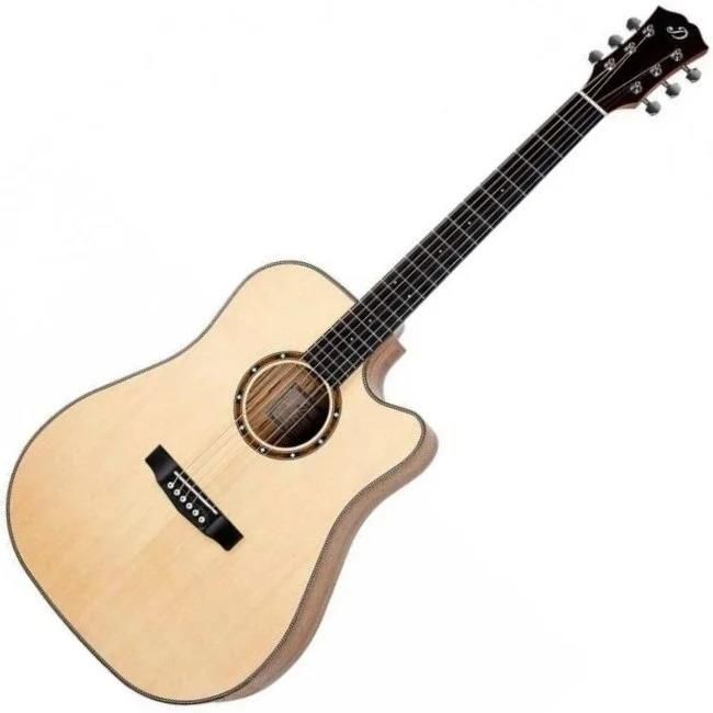 Egzotyczne drewno Zebrano odgrywa główną rolę w tym modelu Dowina, pięknie zestawione z jasno zabarwionym świerkiem, tworząc efektowny kontrast wizualny. Jeśli pies jest najlepszym przyjacielem człowieka, to świerk sitkajski jest najlepszym przyjacielem lutnika – niezawodny, przewidywalny i wyrazisty. Odpowiedni do wielu stylów gry, ale szczególnie dobrze wspiera dynamiczne akordy i techniki fingerpickingu, oferując klarowność oraz wyrazistą projekcję dźwięku. Dowina Muscat to instrument stworzony z myślą o wymagających gitarzystach, którzy cenią zarówno wygląd, jak i brzmienie. Zebrano nie tylko przyciąga wzrok unikalnym usłojeniem, ale także dodaje głębi tonom średnim i niskim. Świerk sitkajski jako płyta wierzchnia zapewnia klarowność i odpowiedź dynamiczną, co sprawia, że gitara świetnie sprawdza się zarówno na scenie, jak i podczas domowego grania. Model ten wyposażony jest również w przetwornik, który wiernie oddaje naturalne brzmienie instrumentu, czyniąc go doskonałym wyborem dla muzyków koncertujących. SPECYFIKACJA Kształt:Dreadnought Cutaway Płyta wierzchnia:Świerk Sitkajski Tył i boki:Zebrano Gryf:Nato Podstrunnica:Hardwood Mostek:Hardwood Siodełko:45mm Progi:20 Elektronika:Tak, Fishman Presys + Kolor:Natural Wykończenie:Open Pore