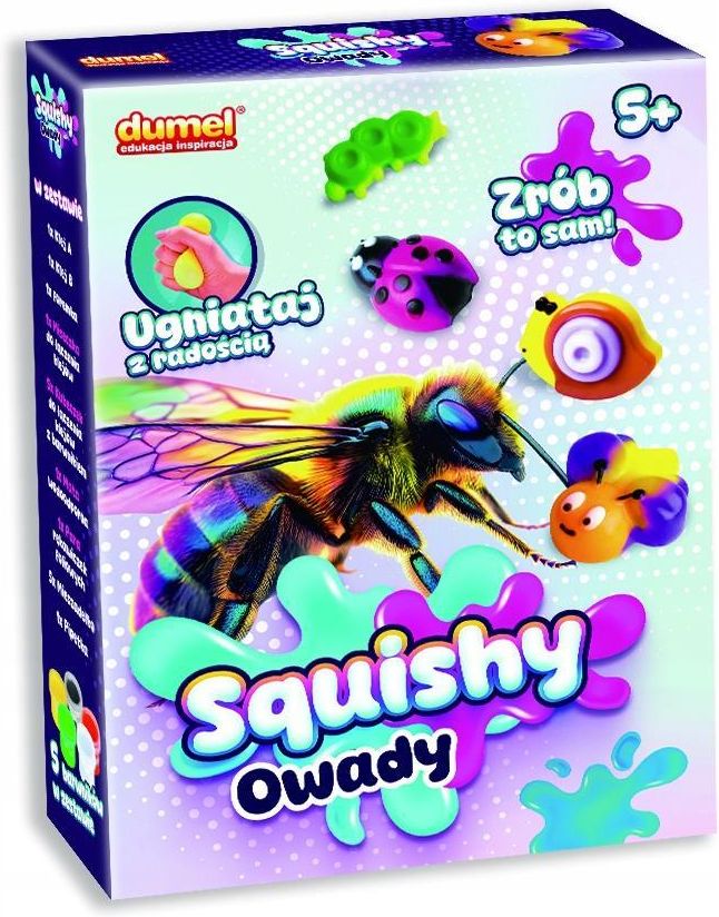 Co powstanie z połączenia klejących mas i barwników? Rodzinka kolorowych owadów squishy! Obudź wyobraźnię i rozwijaj kreatywność, tworząc „gumowe” stworki, zgodnie z własnym pomysłem. Aby rozpocząć zabawę, połącz ze sobą kleje i rozlej je do kubeczków, a następnie do każdego z nich dodaj barwnik w innym kolorze. Teraz wypełnij zagłębienia w foremce mieszankami w różnych kolorach, wlewając do nich miksturę bezpośrednio z kubeczków lub przy użyciu dołączonej pipety, która z pewnością przyda się do wykonania detali, jak kropki, czułki lub oczka. Po zapełnieniu foremki, odstaw ją do całkowitego wyschnięcia, a gdy masa stężeje, delikatnie wyjmij z foremki swoje kolorowe squishy. Produkt przeznaczony jest dla dzieci od 5 roku życia. Cechy produktu: - zestaw kreatywny, pozwalający na stworzenie własnych squishy; - aby przygotować squishy, zmieszaj ze sobą kleje i rozlej tak przygotowaną miksturę do kubeczków; do każdego z kubeczków dodaj inny barwnik i dokładnie je wymieszaj, a następnie zalej foremkę barwnymi mieszankami i pozostaw foremkę do wyschnięcia (minimum na 2h, a najlepiej na całą dobę); po tym czasie delikatnie wyciągnij squishy z foremki; - w zestawie: 1 x klej A, 1 x klej B, 5 x barwnik, 1 x foremka, 1 x miseczka do łączenia klejów, 5 x kubeczek do łączenia klejów z barwnikiem, 1 x mata wodoodporna, 1 x para rękawiczek foliowych, 5 x mieszadełko, 1 x pipeta; - aby uniknąć zabrudzenia barwnikami, pamiętaj, aby przed przystąpieniem do tworzenia zabezpieczyć ubranie oraz przestrzeń wokół siebie; Squishy-Owady DUMEL DD 30609 to miękka, sprężysta zabawka sensoryczna, która zapewnia dziecku relaksującą i kreatywną zabawę. Wykonana z bezpiecznej pianki poliuretanowej, po ściskaniu powoli wraca do pierwotnego kształtu, co sprawia, że idealnie sprawdza się jako antystresowa zabawka dla dzieci. Zabawka przedstawia kolorowe owady w przyjaznej, zabawnej formie, co rozwija wyobraźnię, pobudza ciekawość świata i wspiera rozwój motoryki małej. Zalety produktu: Miękka i sprężysta – idealna do ściskania i ugniatania Rozwija koordynację ręka–oko i zdolności manualne Wspiera relaks i redukcję stresu Kolorowy, atrakcyjny design – realistyczne i zabawne owady Wykonana z bezpiecznych, nietoksycznych materiałów Dane techniczne: Model: DD 30609 Typ: Squishy sensoryczny Wiek dziecka: 5+ Dlaczego warto wybrać zabawkę Dumel? Dumel to marka znana z kreatywnych, bezpiecznych i trwałych zabawek. Squishy-Owady łączy zabawę, rozwój zdolności manualnych i relaks, czyniąc go doskonałym prezentem dla dzieci w każdym wieku.