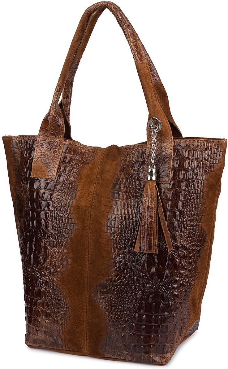 Rewelacyjna, modna, śliczna, skórzana torba- worek w stylu shopper w fantastycznych kolorach, wyprodukowana we Włoszech, z włoskiej skóry naturalnej Torebkę wyprodukowano we Włoszech z połączenia wysokiej jakości zamszowej oraz licowej skóry naturalnej Wykonana jest niezwykle starannie, z dbałością o najdrobniejsze szczegóły Posiada solidne okucia w srebrnym kolorze Torba swobodnie pomieści format A4 Jest zamykana na suwak Jest lekka, a jej kształt i materiał sprawiają, że jest bardzo wygodna w użytkowaniu; dopasowuje się do ciała W komplecie z torebką znajduje się niewielka saszetka Torba idealnie sprawdzi się na co dzień Wygląda niezwykle oryginalnie dzięki ciekawemu połączeniu zamszu z fakturą imitującą skórę krokodyla Modną ozdobę stanowi również długi, zamszowy frędzel, będący brelokiem przy łańcuszku mocującym saszetkę wewnątrz torby Torba posiada jedną, zamykaną na suwak komorę, wewnątrz której znajduje się mała, boczna, zasuwana kieszonka Wnętrze torby wykończono solidną podszewką Saszetka jest wykonana z tego samego materiału, co torbaPomaga uporządkować przechowywane w niej rzeczyPosiada jedną, zasuwaną komorę Torba ma podwójne skórzane uszy o długości ok. 50 cm Wymiary torby Wysokość: ok.36 cm Szerokość( mierzona u góry): ok.42 cm Szerokość( mierzona u dołu): ok.26 cm Grubość: ok.18 cm Wymiary saszetki Wysokość: ok.13 cm Szerokość: ok.19 cm Najważniejsze parametry techniczne tego ekskluzywnego produktu Kod produktu (SKU): L94 Materiał: 1- Skóra naturalna Marka: Vera Pelle Wielkość: Duża, mieszcząca A4 Mieści laptopa 15,6": Tak