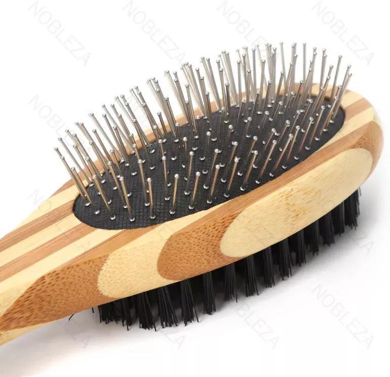 Rewelacyjna dwustronna szczotka dla psa i kota. Niezastąpione narzędzie, którym z łatwością doprowadzisz futro pupila do perfekcji. chr(13) Dwustronna szczotka, jedna strona z szpilkami, a druga strona z włosiem. Szpilki mogą usunąć martwe włosy, a okrągłe końcówki nie uszkadzają skóry. Włosie służy do szczotkowania luźnych włosów i zanieczyszczeń z ciała zwierzęcia. Może również zapewnić masaż i kąpiel dla zwierząt. Profilowany drewniany uchwyt, szpilki ze stali nierdzewnej. Ergonomiczny bambusowy uchwyt zapewnia komfortową obsługę, a możliwość użycia przez osoby leworęczne sprawia, że każdy może cieszyć się łatwą pielęgnacją. Kolor produktu: Beżowy/brązowy Rozmiar: L Wymiary: L23*W7cm Dla: Psa i kota Materiał wykonania: Bambus Z jednej strony, nasza szczotka wyposażona jest w metalowe igły stali nierdzewnej, doskonale radzące sobie nawet z najbardziej opornymi sierściami. Rozwiązanie dla psów i kotów o długiej, szorstkiej czy wełnistej sierści. Bez problemu usuniesz zanieczyszczenia i martwe włosy, pozostawiając futro lśniące i zdrowe. Z drugiej strony znajdziesz włosie miękkie, delikatne dla skóry Twojego zwierzaka. To prawdziwa uczta dla krótkowłosych pupili, zapewniająca im delikatne, przyjemne doświadczenie podczas pielęgnacji.