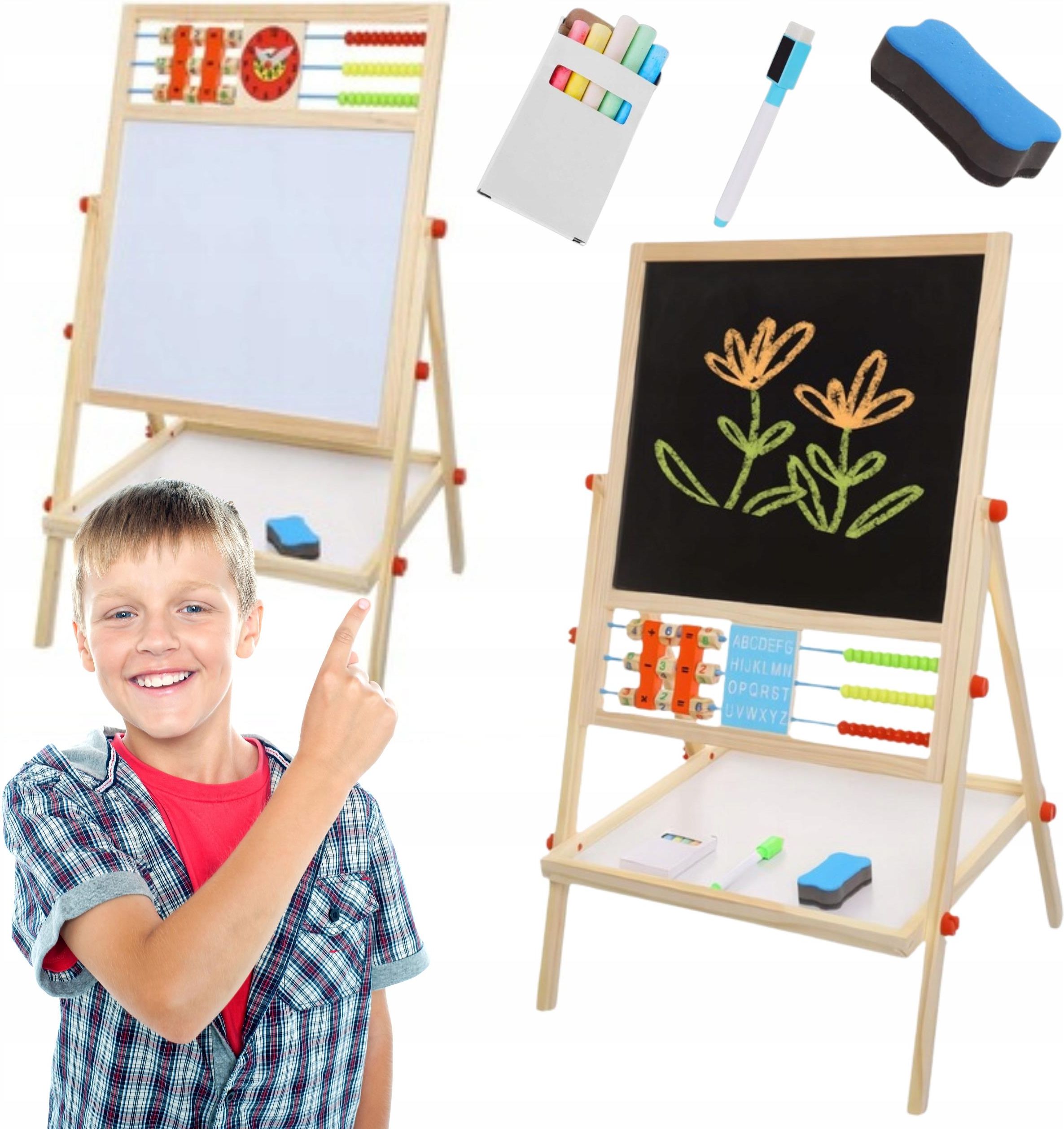 DWUSTRONNA TABLICA MAGNETYCZNA OBROTOWA KREDOWA SUCHOŚCIERALNA AKCESORIA Rozwiń kreatywność i ciekawość świata swojego dziecka z edukacyjną tablicą magnetyczną 6w1, która łączy naukę, zabawę i twórcze odkrywanie! To wszechstronne narzędzie edukacyjne pozwala rysować kredą i markerem, uczyć się liczyć, poznawać alfabet oraz rozpoznawać godziny – wszystko w jednej, stabilnej konstrukcji z naturalnego drewna. Idealna do domu, przedszkola lub kącika zabaw – tablica magnetyczna 6w1 wspiera rozwój dzieci już od najmłodszych lat, pobudzając wyobraźnię, koncentrację i zdolności manualne. Dlaczego warto wybrać tablicę 6w1? 6 funkcji w 1 produkcie – kredowa, suchościeralna, z liczydłem, zegarem, alfabetem i działaniami matematycznymi Dwustronna konstrukcja – czarna strona do pisania kredą, biała do markerów suchościeralnych Obrotowa rama – łatwe przełączanie między powierzchniami za pomocą dużych, bezpiecznych śrub Naturalne drewno – trwałe, ekologiczne i bezpieczne dla dzieci materiały Bezpieczne wykończenie – zaokrąglone krawędzie, nietoksyczne farby i gładka powierzchnia Stabilna i solidna – odporna na codzienne użytkowanie i intensywną zabawę Półka na akcesoria – wszystko w zasięgu ręki: kredy, pisak, gąbka i drobiazgi Pełen zestaw akcesoriów – dołączone kredy, pisak i gąbka pozwalają zacząć zabawę od razu po rozpakowaniu Łatwy montaż – szybkie złożenie bez narzędzi dzięki plastikowym śrubkom Ekologiczna i zgodna z normami UE – wykonana z przyjaznych środowisku materiałów, bezpieczna i certyfikowana Specyfikacja produktu Rodzaj: tablica magnetyczna, kredowa, suchościeralna, obrotowa Konstrukcja: drewniana Funkcje: 6w1 (rysowanie, pisanie, liczenie, nauka godzin, alfabet, działania matematyczne) Wymiary: ok. 41 cm szerokości Wiek dziecka: 3+ Materiał: naturalne drewno + bezpieczne elementy plastikowe W zestawie: tablica, kredy, pisak, gąbka, półka na akcesoria, liczydło, zegar, alfabet Montaż: bez narzędzi, szybki i prosty Zgodność: europejskie normy bezpieczeństwa Kod producenta: Tablica Magnetyczna 6w1 Zawartość zestawu Dwustronna tablica magnetyczna (czarna + biała) Liczydło z kolorowymi koralikami Zegar z ruchomymi wskazówkami Alfabet i działania matematyczne Półka na akcesoria Kredy, pisak i gąbka Instrukcja montażu 🎁 Doskonały prezent edukacyjny! Tablica 6w1 to idealny pomysł na prezent dla dziecka – rozwija, uczy i bawi jednocześnie! Doskonale sprawdzi się na urodziny, Dzień Dziecka czy pod choinkę. Dzięki eleganckiemu opakowaniu i dodatkowej ochronie w kartonie transportowym, możesz mieć pewność, że dotrze w idealnym stanie. Zainspiruj dziecko do nauki przez zabawę – z tablicą 6w1 każdy dzień to nowa okazja do odkrywania, rysowania i tworzenia! 🖍️📚💡