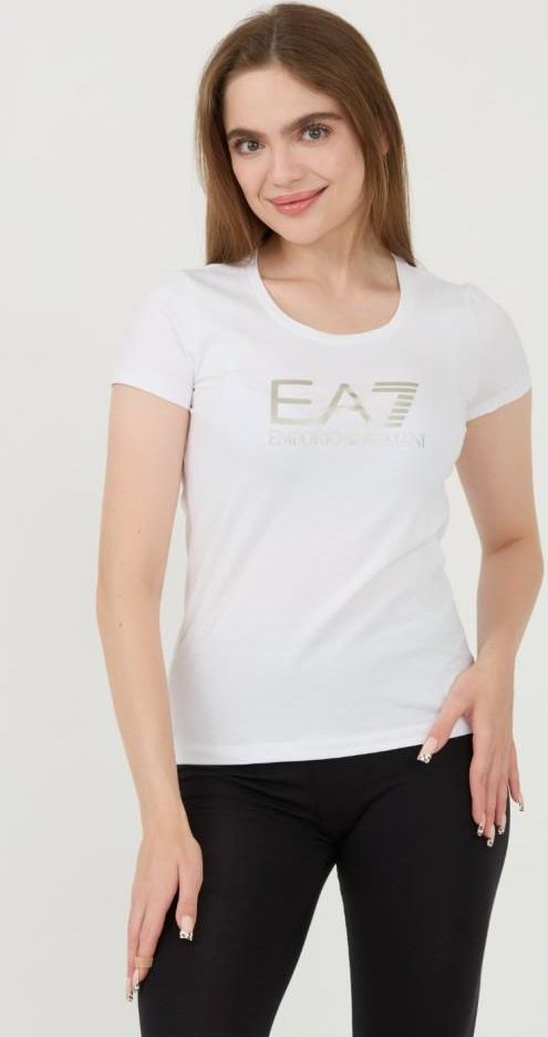Biały t-shirt damski, marki EA7 Emporio Armani.Wymiary modelki: wzrost 172 cm, biust 82 cm, talia 62 cm, biodra 90 cm. Modelka ma na sobie produkt w rozmiarze XS.Wymiary produktu w rozmiarze XS: szerokość pod pachami: 41,5 cm, długość całkowita: 57,5 cm.