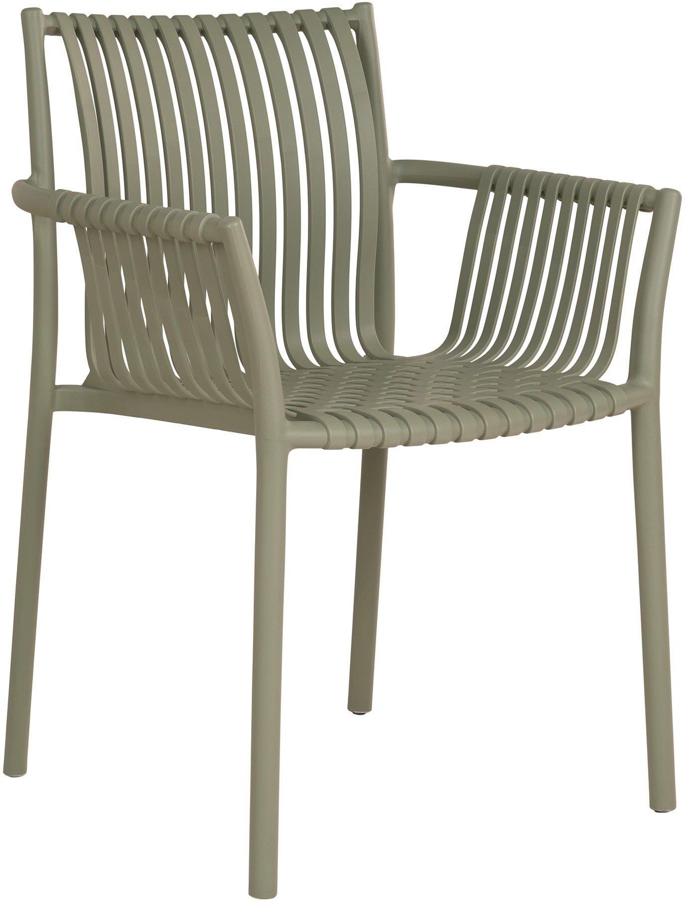 Krzesło ogrodowe Tulsa szałwia od marki Intesi Jeśli szukasz krzesła, które sprawdzi się na zewnątrz i jednocześnie będzie stylowe, to krzesło ogrodowe Tulsa szałwia od marki Intesi jest dla Ciebie. Wykonane z polipropylenu, to krzesło jest nie tylko trwałe, ale również lekkie, co ułatwia jego przenoszenie. Siedzisko jest wyprofilowane, co zapewnia komfort podczas siedzenia, a podłokietniki dodają dodatkowego wsparcia. Komfortowe krzesło z tworzywa sztucznego z podłokietnikami Tworzywo sztuczne, z którego wykonane jest krzesło, jest łatwe do czyszczenia, co czyni je idealnym meblem do użytku na zewnątrz. Wyprofilowane siedzisko i podłokietniki zapewniają maksymalny komfort podczas siedzenia, a maksymalne obciążenie wynoszące 110 kg sprawia, że krzesło jest stabilne i bezpieczne do użytku. Stylowe krzesło Intesi w kolorze szałwiowym Krzesło Tulsa szałwia od Intesi to połączenie funkcjonalności i stylu. Szałwiowy kolor krzesła doda elegancji każdemu ogrodowi, tarasowi czy balkonowi. Wykonane z pasów z plastiku, krzesło ma klasyczny wygląd, który pasuje do różnych stylów dekoracji. Co powinieneś wiedzieć przed zakupem Krzesło Tulsa szałwia jest wykonane z polipropylenu, co gwarantuje jego trwałość i odporność na warunki atmosferyczne. Siedzisko jest wyprofilowane i posiada podłokietniki, co zapewnia komfort podczas siedzenia. Maksymalne obciążenie krzesła wynosi 110 kg, co czyni go stabilnym i bezpiecznym do użytku. Krzesło jest łatwe do czyszczenia, co jest szczególnie ważne w przypadku mebli używanych na zewnątrz. Szałwiowy kolor krzesła doda elegancji każdemu ogrodowi, tarasowi czy balkonowi.
