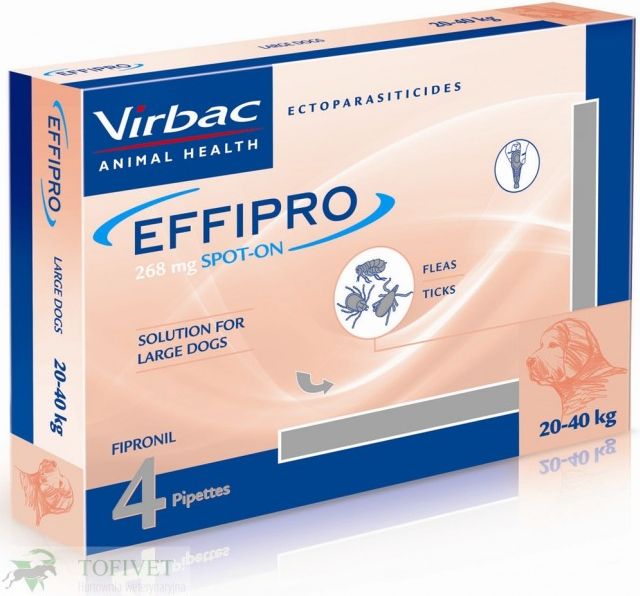 Effipro Spot-On dla dużych psów L - 24 pipety Grupy produktów: leki przeciw pasożytom zewnętrznym Gatunki zwierząt: psy Roztwór do nakrapiania zawierający fipronil. Zawartość substancji czynnych i innych substancji Substancja czynna: Każdy 1 ml zawiera 100 mg fipronilu. Każda pipetka effipro …