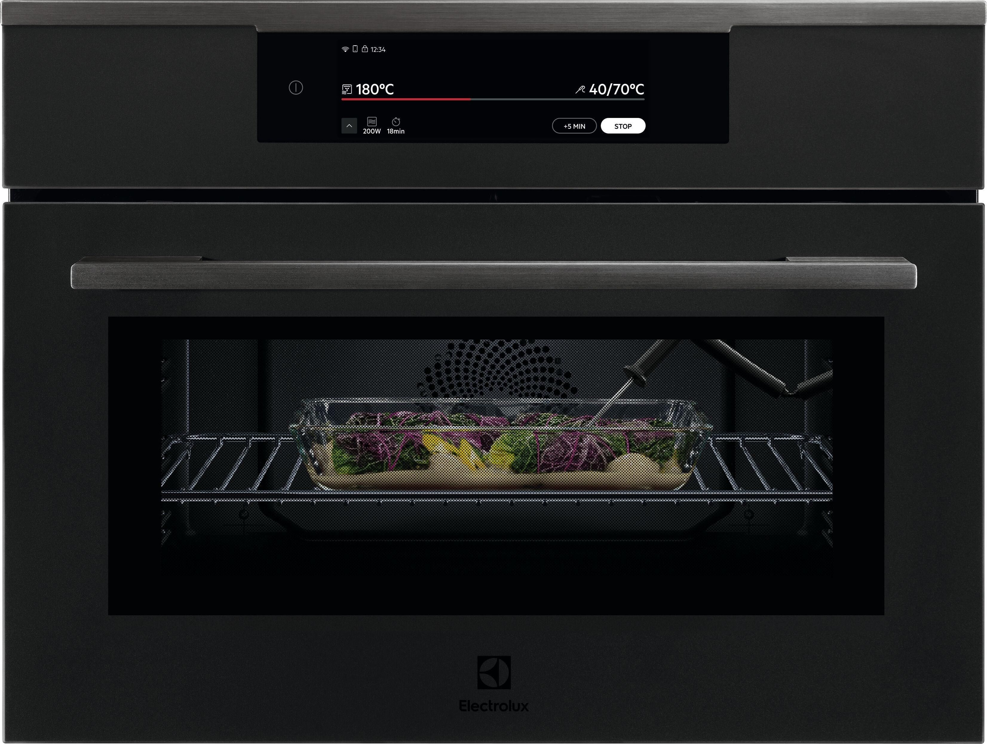 Piekarnik kompaktowy do zabudowy Electrolux KVLAE2ST ProAssist CombiQuick z funkcją mikrofali Czarny matowy 900 Funkcje Kompaktowe urządzenie do zabudowy Piekarnik z funkcją mikrofali Panel: szklany panel w stalowej ramce Funkcje: grzanie dolne, pieczenie konwencjonalne + mikrofale, rozmrażanie, suszenie, wyrastanie ciasta, grill, grill + mikrofale, gorące powietrze, gorące powietrze i grzanie dolne, gorące powietrzne i grzanie górne, grzanie góra/dół, utrzymywanie ciepła, roztapianie, grill turbo + mikrofale, mikrofale, ogrzewanie talerzy, utrzymywanie temperatury, podgrzewanie, pieczeń, powolne gotowanie, gulasz, grzanie górne, Top & Bottom heat, termoobieg + mikrofale Funkcja pamięci, możliwość zapisania często używanych ustawień Termosonda Elektroniczna regulacja temperatury Automatyczne propozycje temperatury Funkcja szybkiego nagrzewania Moc mikrofal: 1000 W Możliwość pieczenia na 2 poziomach jednocześnie Wskaźnik ciepła pozostałego Blachy dołączone do piekarnika: 1 emaliowana blacha, 1 emaliowana brytfanna Zabezpieczenie przed dziećmi: Funkcja zabezpieczająca przed przypadkowym uruchomieniem urządzenia. Halogenowe oświetlenie piekarnika Wentylator chłodzący: Wentylator chłodzący uruchamia się automatycznie po włączeniu urządzenia. Chłodzi komponenty elektroniczne i części zewnętrzne. Zużycie energii Moc oświetlenia : 25 Specyfikacja Tryby gotowania: grzanie dolne, pieczenie konwencjonalne + mikrofale, rozmrażanie, suszenie, wyrastanie ciasta, grill, grill + mikrofale, gorące powietrze, gorące powietrze i grzanie dolne, gorące powietrzne i grzanie górne, grzanie góra/dół, utrzymywanie ciepła, roztapianie, grill turbo + mikrofale, mikrofale, ogrzewanie talerzy, utrzymywanie temperatury, podgrzewanie, pieczeń, powolne gotowanie, gulasz, grzanie górne, Top & Bottom heat, termoobieg + mikrofale Funkcja Connectivity: tak Wyświetlacz: SUPEX8 Pojemność użytkowa : 44 Sposób czyszczenia: emalia samoczyszcząca Interfejs: sterowanie dotykowe Maks. temperatura powierzchni drzwi powyżej temp otoczenia (zgodnie z normą EN30 lub 60335-1): 20 Tryby gotowania: mikrofale/wielofunkcyjne Dane techniczne Kod produktu (PNC): 944 005 126 Kolor: czarny matowy Poziom pary: brak Oświetlenie: 1, halogen góra Typ: Piekarnik elektryczny do zabudowy Brytfanny dołączone do piekarnika: 1 emaliowana blacha, 1 emaliowana brytfanna Rodzaj rusztu: 1, chromowany Prowadnice: Drabinki boczne Easy entry Wyposażenie: zestaw Komora: szara emalia Kod EAN: 7333394108919 Funkcja CookView: nie Delikatne domykanie: tak Instalacja Wymiary w zabudowie (W x S x G) : 450x560x550 Całkowity pobór mocy : 3000 Wymiary WxSzxG : 455x595x567 Waga brutto : 41 Waga netto : 38,5 Długość przewodu : 1,5 Rodzaj wtyczki: Schuko Napięcie : 220-240 Wymagany bezpiecznik : 16 Instalacja: do zabudowy Wysokość : 455 Szerokość : 595 Głębokość : 567 Doskonałe rezultaty nawet dwa razy szybciej Piekarnik 900 ProAssist CombiQuick® łączy termoobieg z zaawansowaną technologią mikrofalową, zapewniając równomierne gotowanie nawet dwa razy szybciej. Wyświetlacz CookSmart Touch+ automatycznie dostosowuje ustawienia i łączy funkcje gotowania. Połącz funkcje mikrofali i piekarnika, żeby gotować nawet dwa razy szybciej Połączenie mikrofali i piekarnika konwekcyjnego pozwala przygotowywać przepyszne posiłki nawet dwa razy szybciej. Funkcja mikrofali skutecznie odgrzewa, gotuje i rozmraża jedzenie. Wentylator piekarnika konwekcyjnego dba o taki obieg powietrza gorącego, by danie było równomiernie ugotowane. Łatwy sposób na smaczniejsze posiłki dzięki wskazówkom CookSmart Touch+ Ułatw sobie codzienne gotowanie i próbuj nowych technik. CookSmart Touch+ pomaga przyrządzać smaczniejsze dania, a przy tym wymaga mniej energii. Dodatkowo możesz odnaleźć ulubione dania za dotknięciem przycisku. Połącz się z aplikacją, by cieszyć się jak najlepszymi doświadczeniami. Automatyczne ustawienia i powtarzalne rezultaty dzięki Gotowaniu wspomaganemu Uzyskaj intuicyjny dostęp do najlepszych ustawień dla różnych dań dzięki funkcji Gotowania wspomaganego. Możesz pozwolić piekarnikowi na automatyczne dostosowanie ustawień albo samodzielnie kontrolować czas i temperaturę. Zamiast zgadywać, użyj termosondy, żeby uzyskać lepsze rezultaty Przepyszne dania za każdym razem. Nowa automatyczna termosonda monitoruje temperaturę i informuje, kiedy jedzenie jest gotowe. Wyszukane i minimalistyczne wzornictwo Poznaj nowy poziom estetyki - eleganckie i wyrafinowane wykończenie Matt Black: kontrastujące matowe i błyszczące szklane powierzchnie p ciemnym odcieniu oraz polerowane krawędzie. Matowa tekstura zapobiega pozostawianiu odcisków palców ułatwiając czyszczenie.