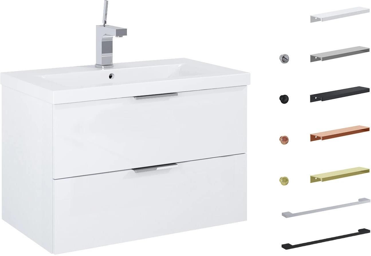 ZESTAW BIAŁA SZAFKA Z UMYWALKĄ CERAMICZNĄ 70 CM 167216S Zestaw łazienkowy - szafka z umywalką ceramiczną 70cm bez uchwytów i bez baterii. 1) Szafka podumywalkowa sprzedawana bez uchwytów. Uchwyty należy dokupić osobno. 2) Szafka do samodzielnego montażu. 3) Szuflady wyposażone w wysokiej klasy prowadnice z funkcją cichego domyku (soft-close). 4) Górna szuflada z miejscem na syfon oraz organizerem. 5) Umywalka ceramiczna wyposażona w przelew. 6) Dedykowane do kompletowania uchwyty krawędziowe 160mm, wykonane z metalu oraz w czterech wariantach kolorystycznych: white mat (169188), black mat (168523), chrom połysk (169187), gold połysk (169189). 7) Uchwyty krawędziowe 160mm - komplet 2 sztuki. 8) Możliwość stosowania dodatkowych wariantów uchwytów: punktowy "KIDO", reling "ROMA 26" 9) Szafka lakierowana - wysoki połysk.