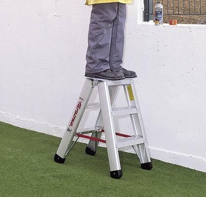 Faraone model ND to dwustronna drabina z szerokimi stopniami. Stopnie nitowane do podłużnic w technologii lotniczej. Anodyzowane aluminiowe profile. Maksymalne obciążenie 150 kg. Gwarancja producenta 5 lat. Odpowiada normie europejskiej EN 131.Wymiary podane na rysunku są orientacyjne. Waga drabiny 4,00 kg. Zdjęcia poglądowe mogą dotyczyć większych lub mniejszych modeli danej serii. Galeria zdjęć: Szerokie stopnie.