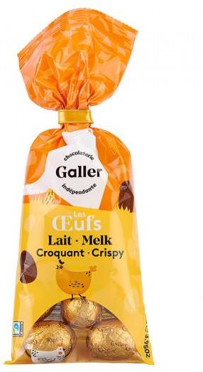 Na słodką i pyszną Wielkanoc, "Galler"- prawdziwi eksperci belgijskiej czekolady - przygotowali czekoladowe jajka, które z pewnością zachwycą tych, którzy są łasuchami. Ta rozkoszna torebka cukierków z mlecznej czekolady wypełnionych chrupiącymi pralinami z orzechów laskowych jest idealna do dzielenia się z rodziną i bliskimi. To także gwarancja, że posłuży jako uroczy prezent wielkanocny. Składniki: cukier, pełne mleko w proszku, orzechy laskowe, masło kakaowe, miazga kakaowa, tłuszcz roślinny (masło shea, olej kokosowy, olej słonecznikowy), chrupiące zboże 1% (mąka ryżowa, cukier, sól, masło kakaowe), inulina, serwatka w proszku (mleko), dekstroza, emulgator: lecytyna sojowa, kakao w proszku, naturalny aromat waniliowy. Czekolada mleczna: masa kakaowa minimum 30%. Może zawierać inne orzechy, jaja i pszenicę (gluten). Chocolaterie Galler opiera się w 100% na certyfikowanych ziarnach kakao Fairtrade, nie stosuje oleju palmowego, konserwantów ani sztucznych aromatów. Warunki przechowywania: przechowywać w temperaturze nie przekraczającej 21°C.