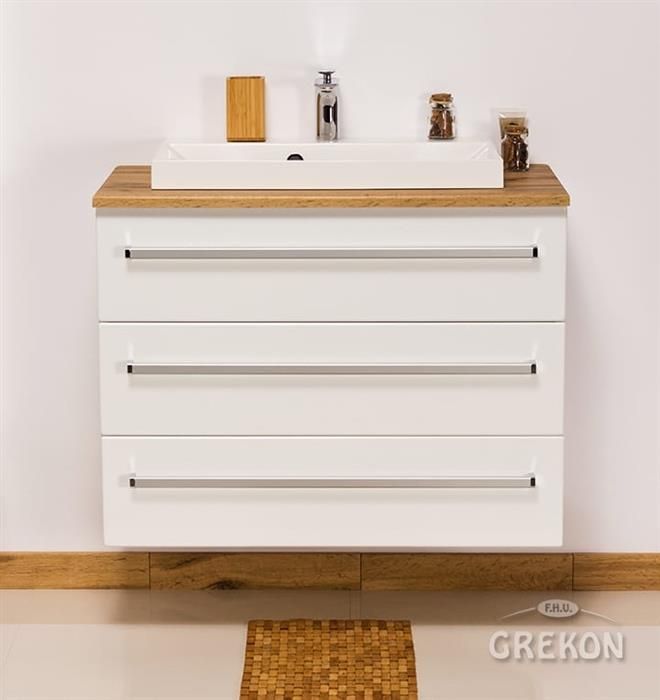 Szafka łazienkowa wisząca z umywalką o szerokości 80 cm. Zestaw z dolomitową umywalką - meble wykonane są w kolorze białym seria Fokus B Gante.