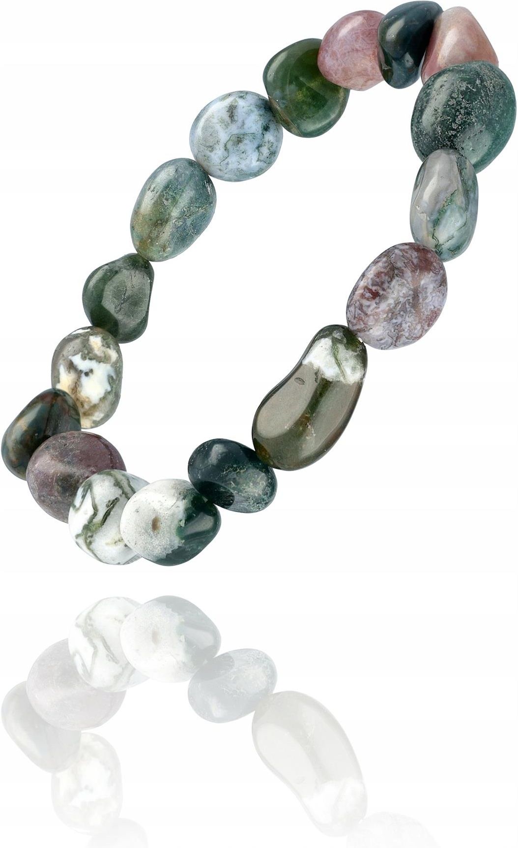 Bransoletka z kamieniami Agat indyjski Bransoletka Informacje Kamień: agat indyjski Rodzaj kamienia: oszlifowany, nieregularny Rozmiar: 15-17 cm Łączenie: biała gumka jubilerska Kolor: wielokolorowy, kolory ziemi Opakowanie: elegancka tekturka biżuteryjna Kształt bransoletki na zdjęciu jest …